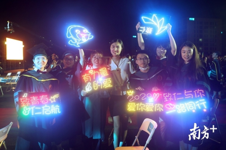 大沙河畔,塘朗山下,毕业生合唱团用一曲《一路向南》唱响毕业典礼。夜幕下,学生们手中的荧光棒点亮了操场,现场连成一片“星海”。