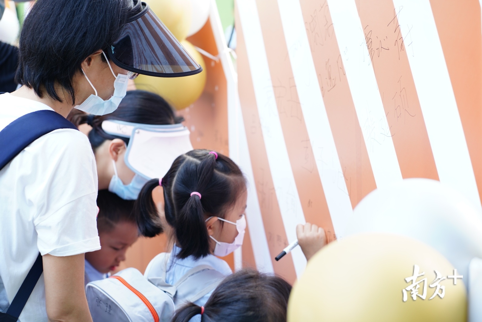 进入幼儿园后,孩子们一次来到签名墙和合影板进行新校园打卡,在爸爸妈妈的指引下一笔一划写下自己的名字。