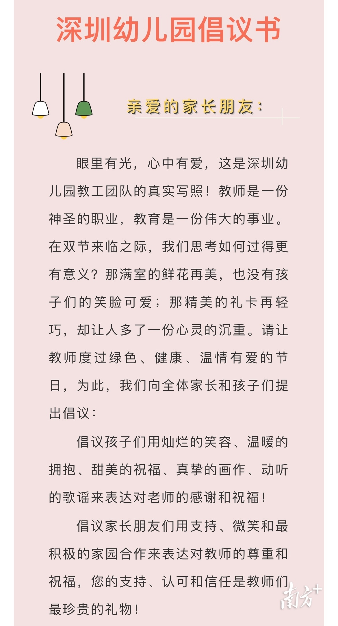 眼里有光,心中有爱,这是深圳幼儿园教工团队的真实写照!教师是一份神圣的职业,教育是一份伟大的事业。在双节来临之际,我们思考如何过得更有意义?那满室的鲜花再美,也没有孩子们的笑脸可爱;那精美的礼卡再轻巧,却让人多了一份心灵的沉重。请让教师度过绿色、健康、温情有爱的节日,为此,我们向全体家长和孩子们提出倡议: