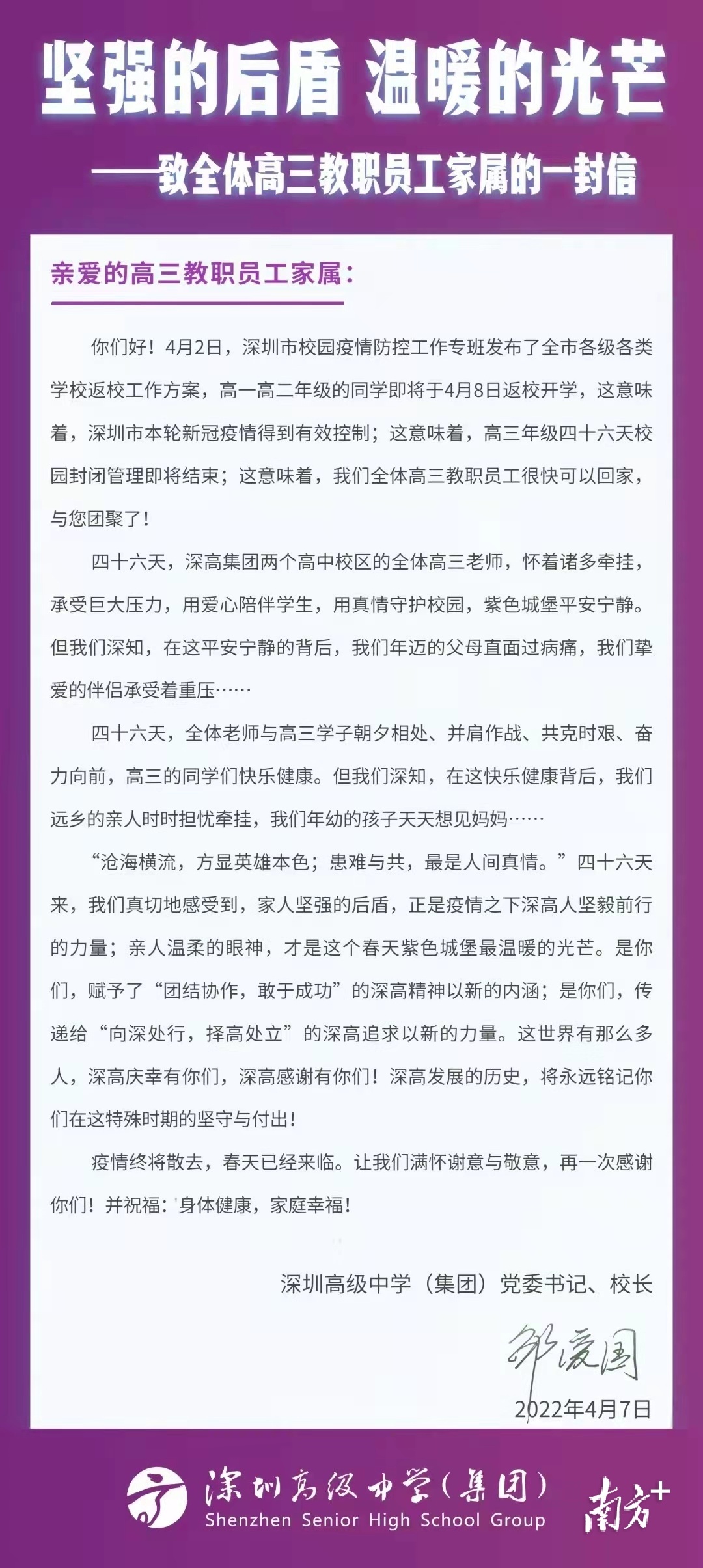 4月7日,深圳高级中学(集团)校长邵爱国给学校全体教职工家属写下一封感谢信,感谢这些教职工家属做坚强的后盾。