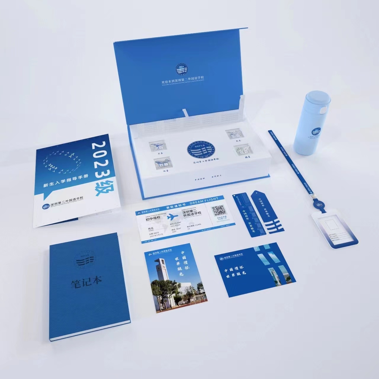 深二外“求真锦囊”外观以书籍样式呈现,主体色为蓝色,整体简洁大气,呈现出学校的办学目标、育人理念等。内有卡套、水杯、书签、笔记本等实用物品。