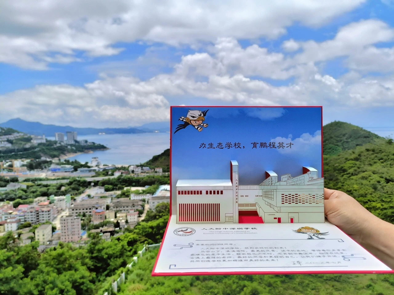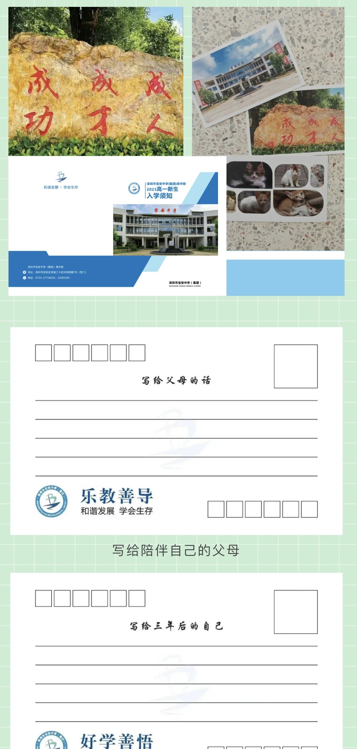 同时,文件袋中装有“乐教善导”“好学善悟”“和谐奋进”三张明信片,分别让新生写给陪伴自己的父母,写给三年后的自己,写给即将见面的老师。