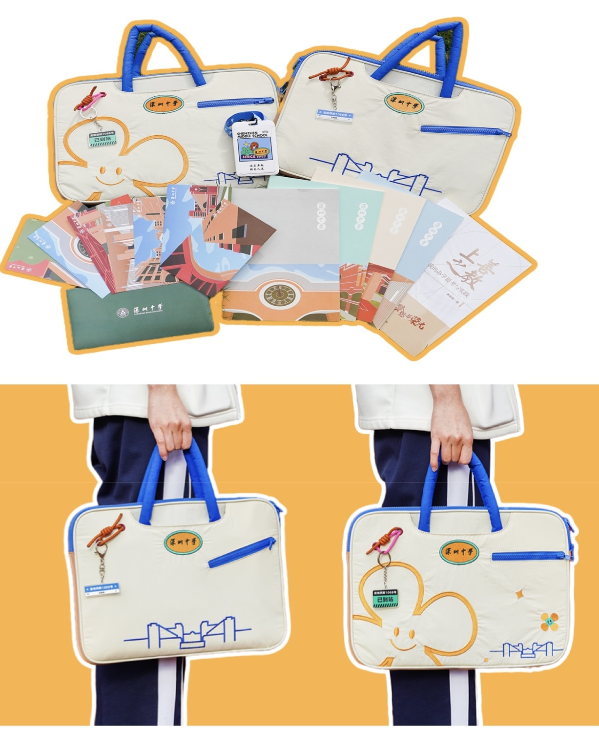 学校特别为新生送上一个可防水、蓝橙配色的轻便手提包, 图案上既有深中建筑的“粗线条”,也有凤凰花的“个性化”,此外,还有独属于深中er的穿绳。