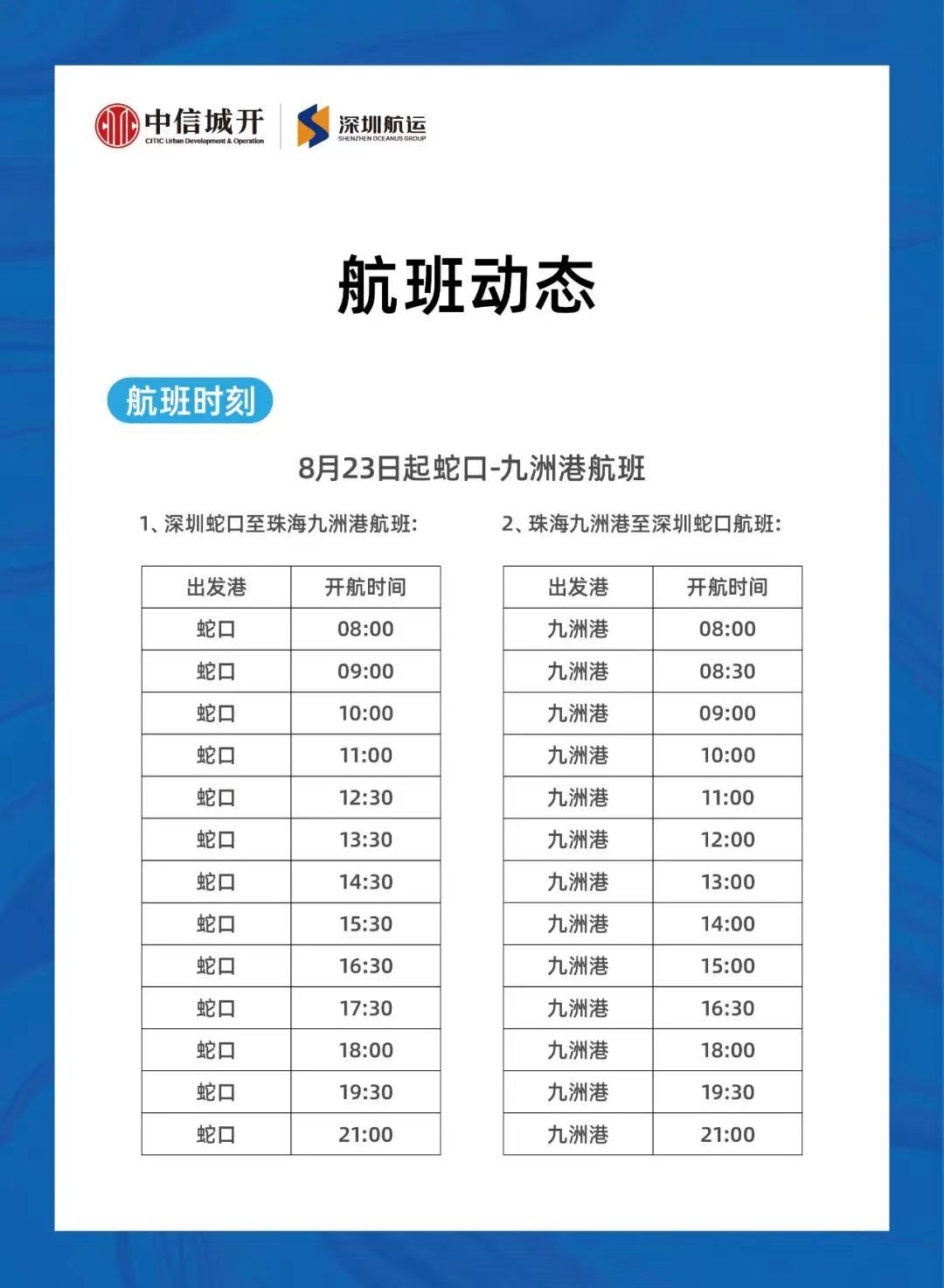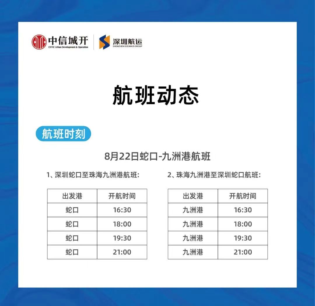 根据疫情防控最新要求,为满足人们往返深珠两地的出行需求,自8月22日下午16时30分起,深圳航运集团将恢复深圳蛇口至珠海九洲港往返航线的航班运营。
