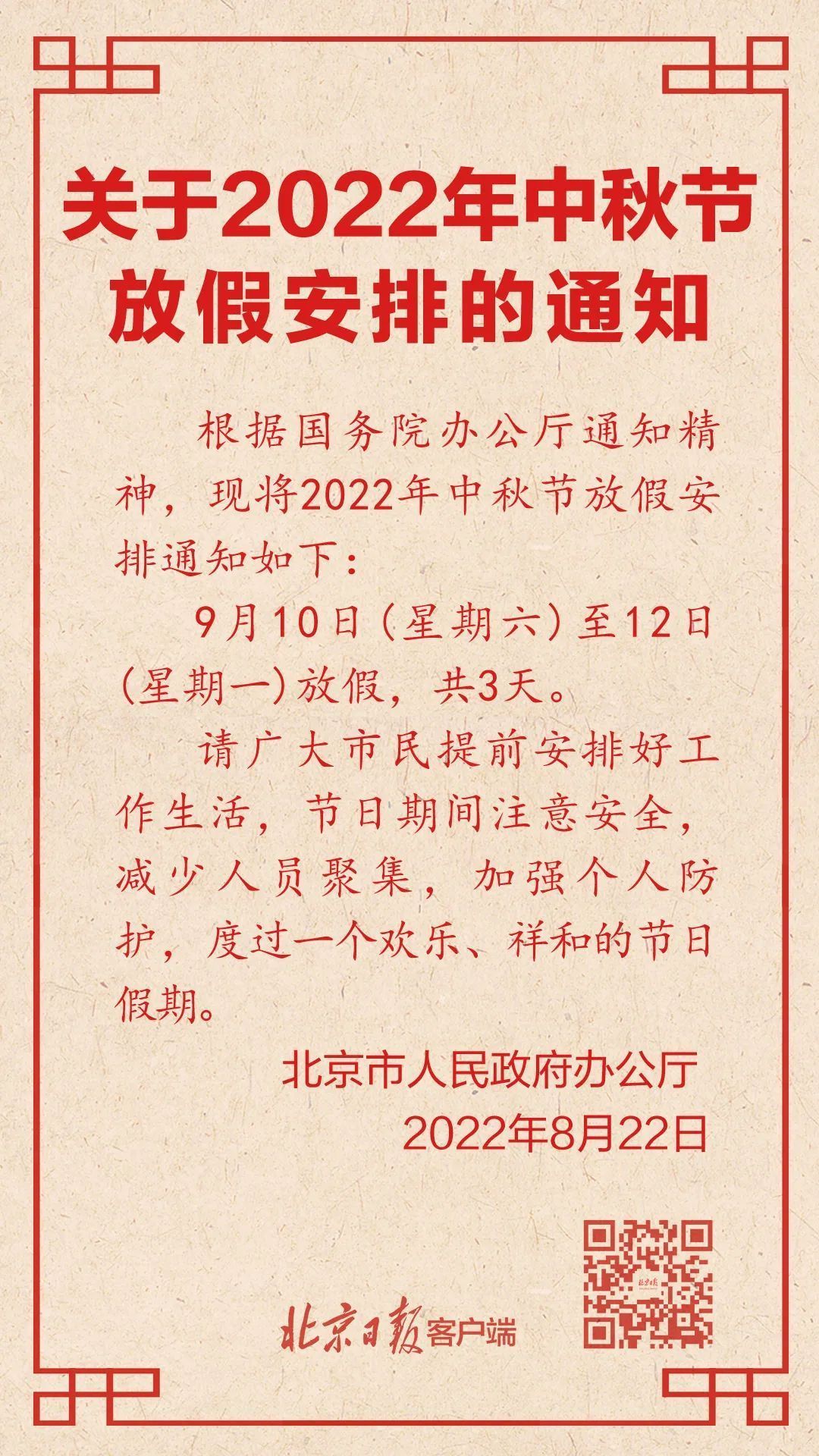 据北京日报消息,北京市人民政府办公厅发布2022年中秋节放假安排的通知,9月10日(星期六)至12日(星期一)放假,共3天。