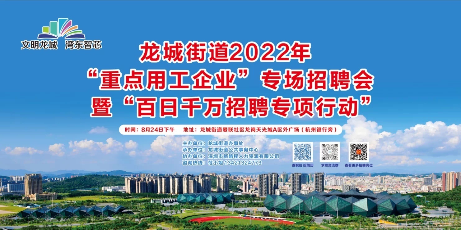 8月24日(周三)下午,深圳市龙岗区龙城街道2022年“重点用工企业”专场招聘会暨“百日千万招聘专项行动”,将在龙城街道爱联社区龙岗天光城举办。本次招聘会可提供近200个岗位。