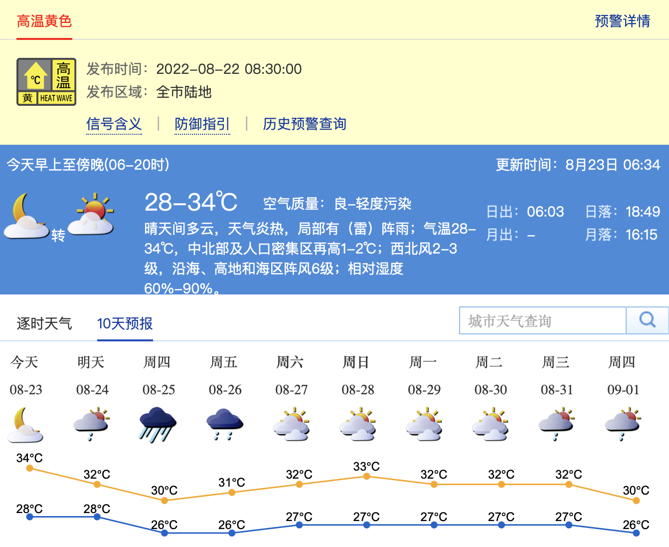 今日晴天间多云,天气炎热,局部有(雷)阵雨;气温28-34℃,中北部及人口密集区再高1-2℃;西北风2-3级,沿海、高地和海区阵风6级;相对湿度60%-90%。