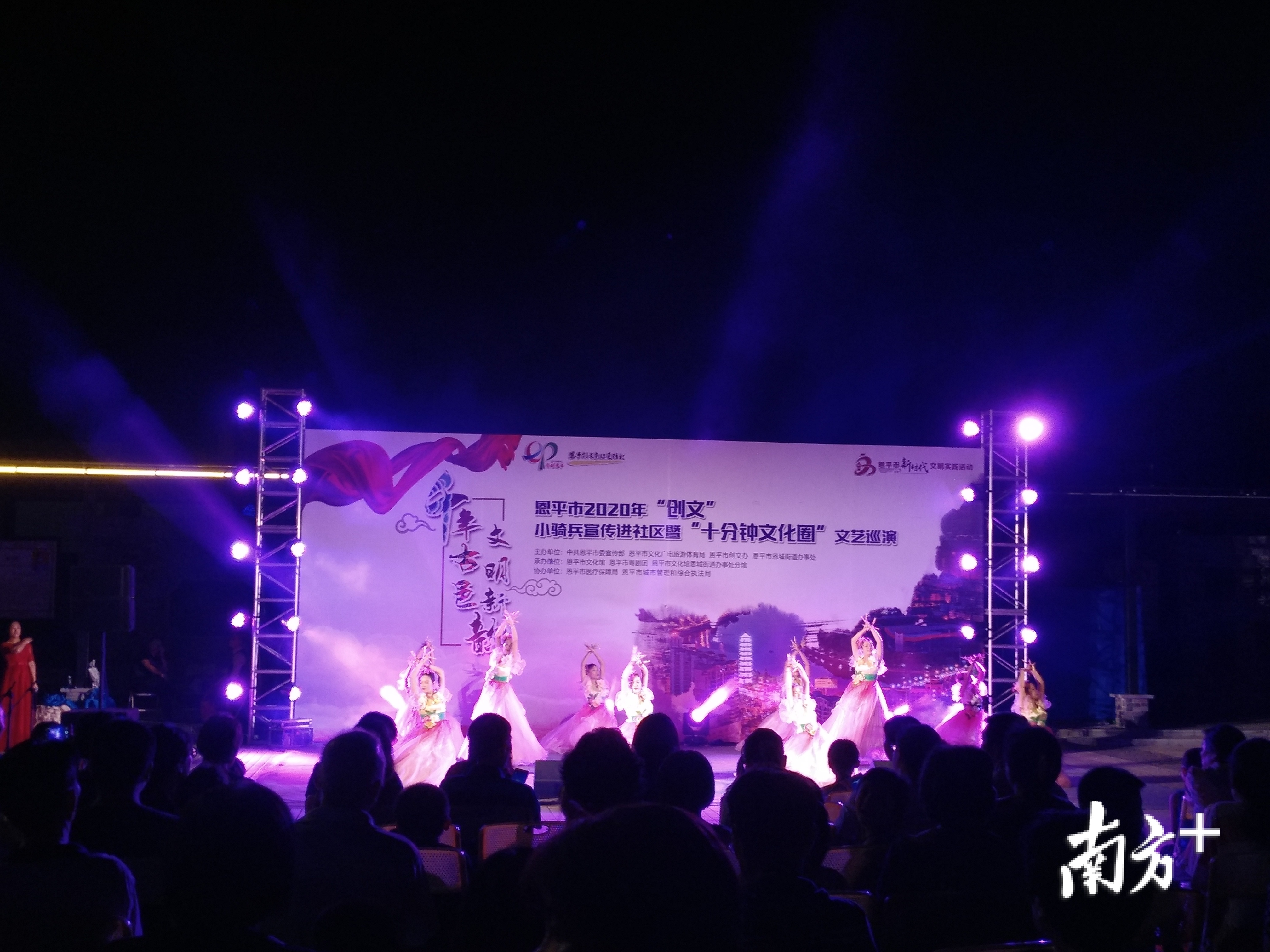 歌曲、舞蹈、歌舞、器乐……8月26日晚上,恩平市中山公园热闹非凡。 “千年古邑,文明新韵”恩平市2020年创文小骑兵宣传进社区暨“十分钟文化圈”文艺巡演在中山公园隆重举行,为广大群众送上一场精彩的文化盛宴。巡演节目主要围绕创建广东省文明城市、扫黑除恶和禁毒等主题进行创作和演出。