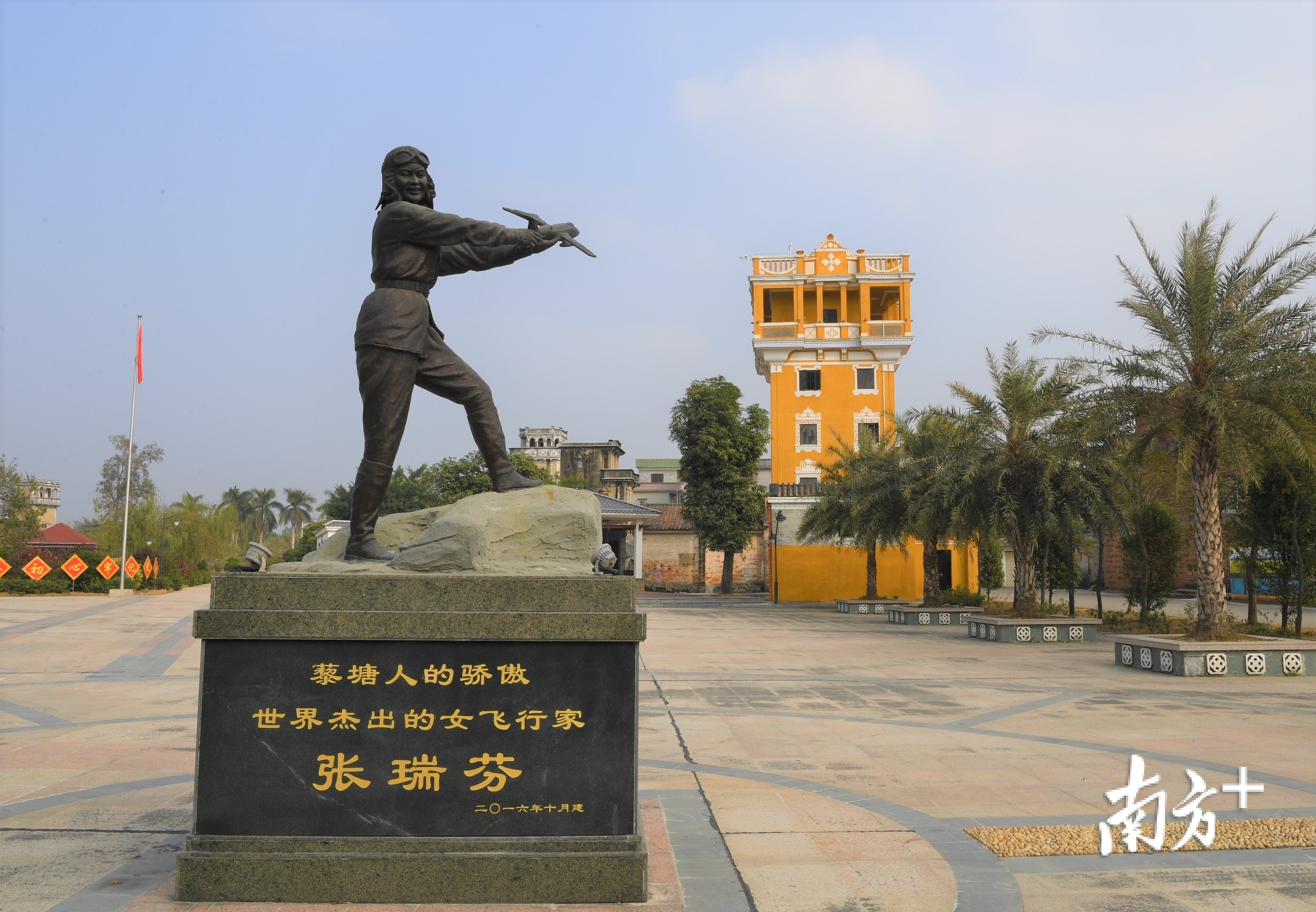 走进黎塘村碉楼文化广场,正中央是华侨华裔第一位特级女飞行家张瑞芬的雕像,右边是修旧如旧的碉楼,旁边还建有供游客休闲小憩的聚贤亭,讲述着从黎塘村“走出去”的华人华侨的故事。