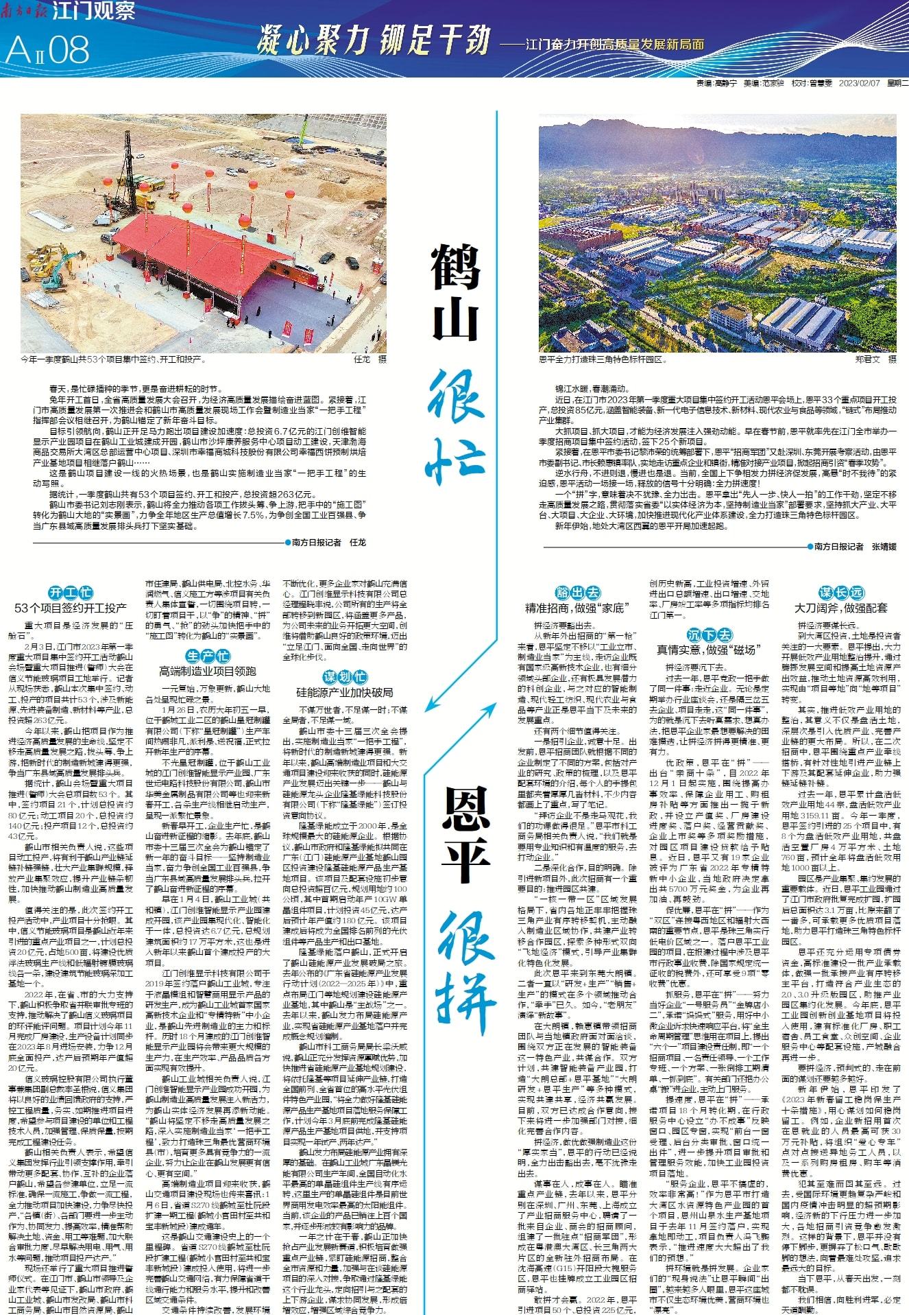 敢拼才会赢。2022年,恩平引进项目50个、总投资225亿元,创历史新高,工业投资增速、外贸进出口总额增速、出口增速、交地率、厂房竣工率等多项指标均排名江门第一。新年刚过去半个月,恩平又率先在江门举办第一季度集中签约活动,签下了25个新项目,总投资73.8亿元。