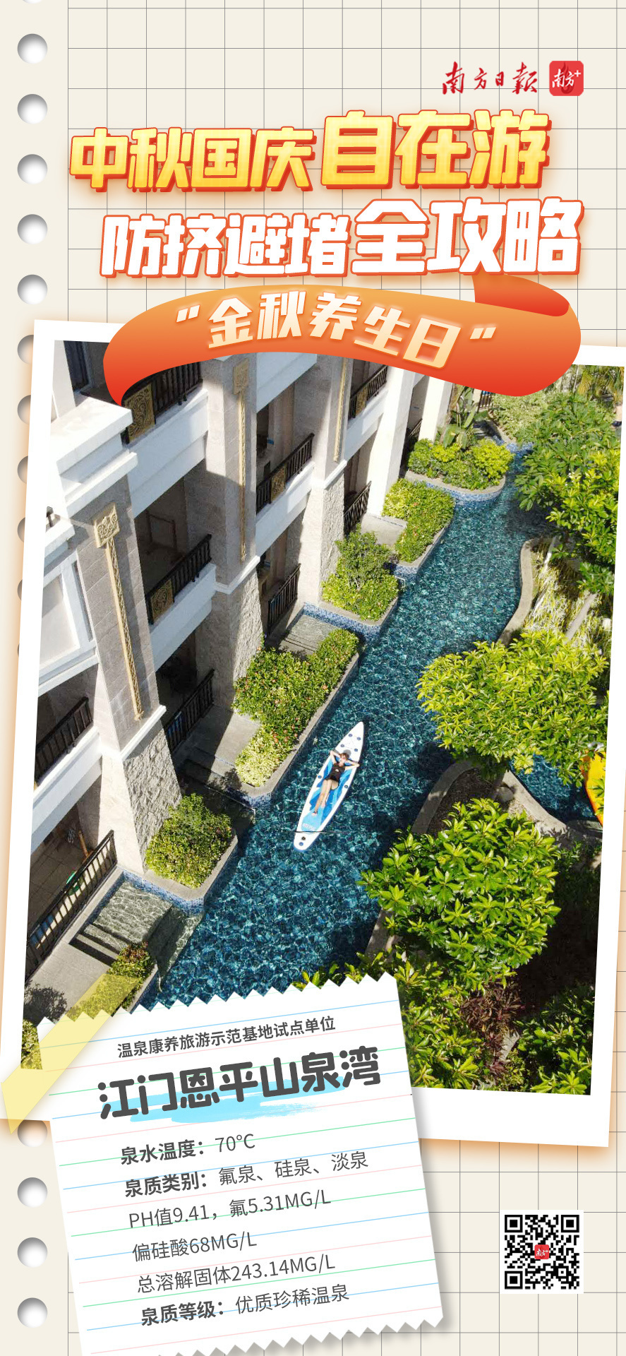 山泉湾温泉城作为广东省中医药文化养生旅游示范基地、省温泉康养旅游示范基地试点单位,依据温泉泉质及四季变化,在温泉区设置搭配不同中医养生浸浴药包的温泉池。国庆假期期间推出秋冬特色的艾叶池、枸杞池、首乌池、当归池等。客房配有恩平特色簕菜茶,供客人饮用,并推出簕菜沐浴粉等特色伴手礼。