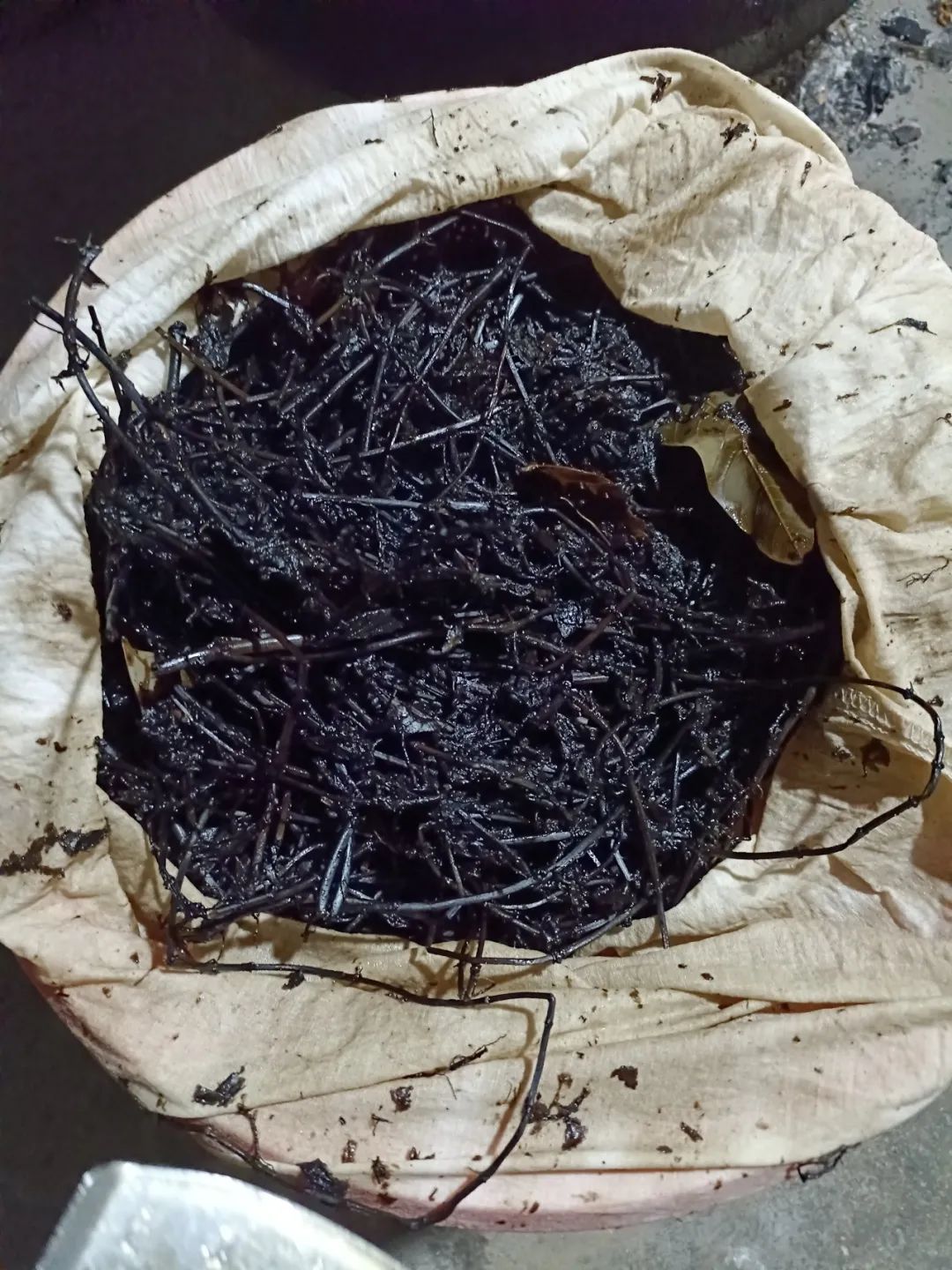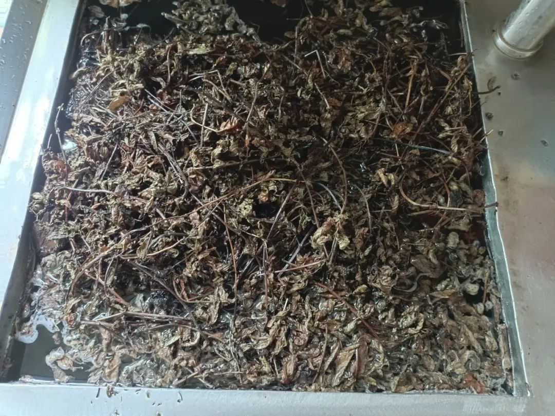 将熬好的凉粉草捞起,用竹篼将凉粉草搓出汁水,再用熬凉粉草的水冲洗,并反复按压,直到凉粉草的茎褪色到白色为止,接着用滤网将凉粉水过滤2次,再用布袋过滤2次,此道工序才算完工。