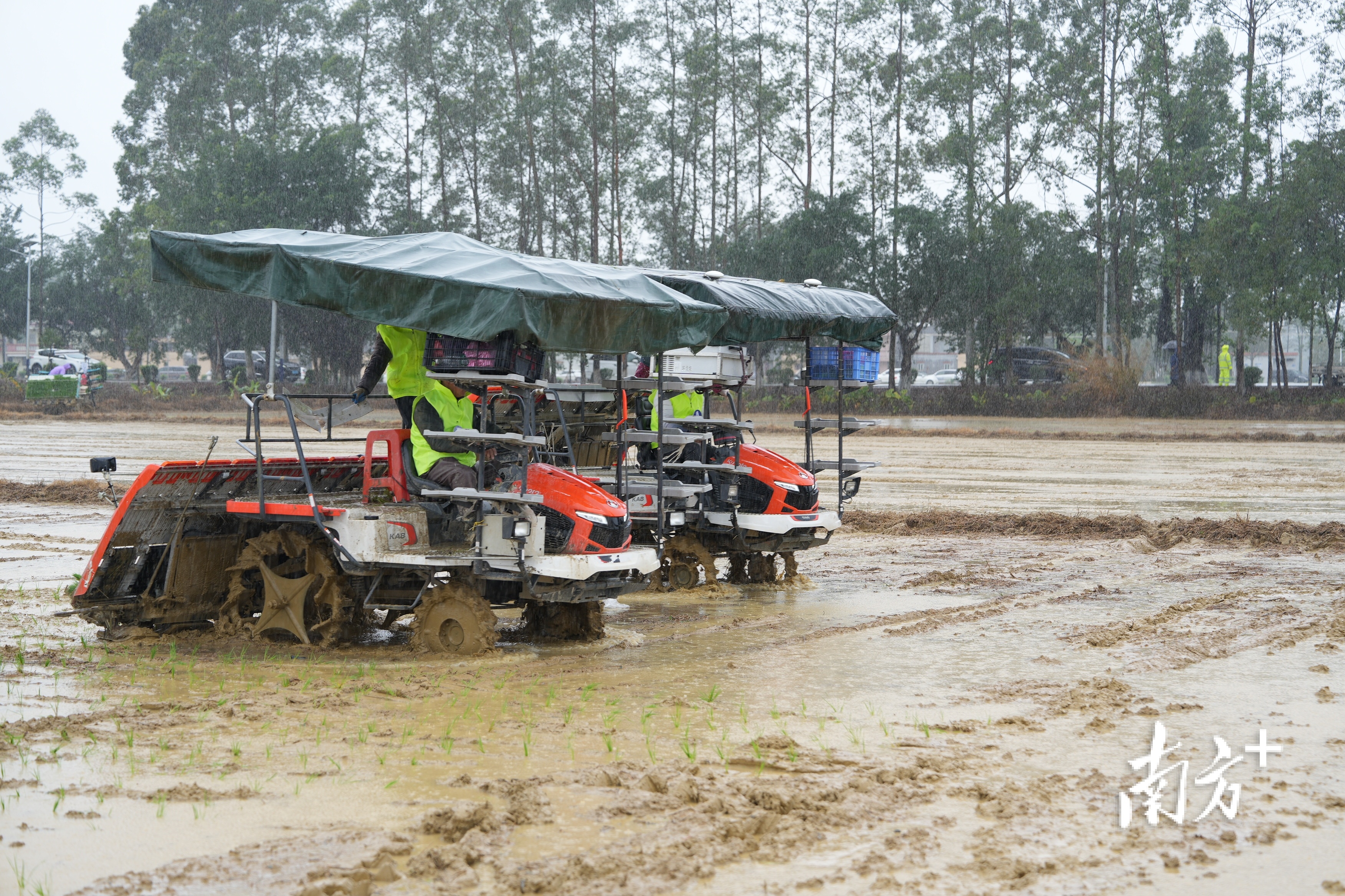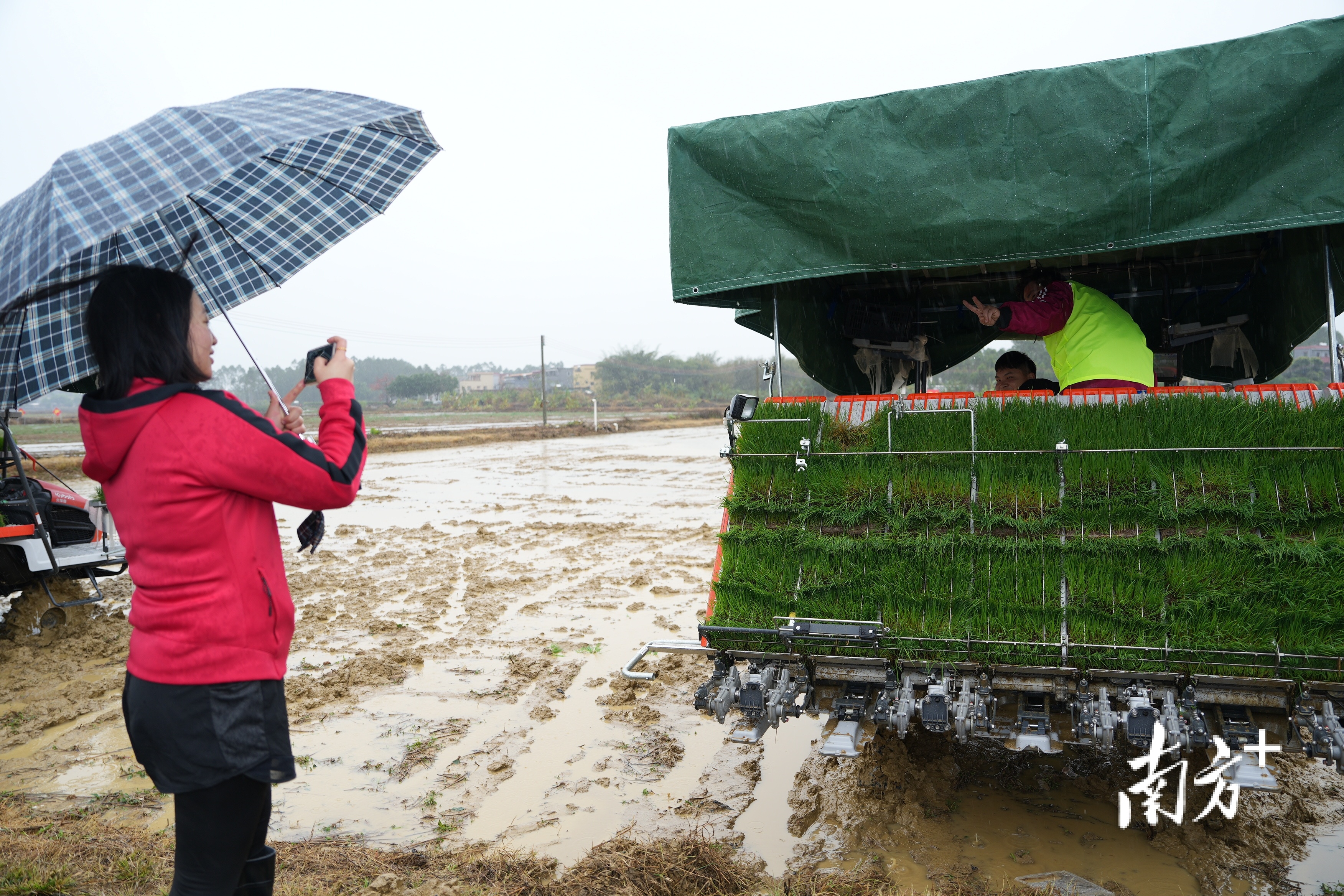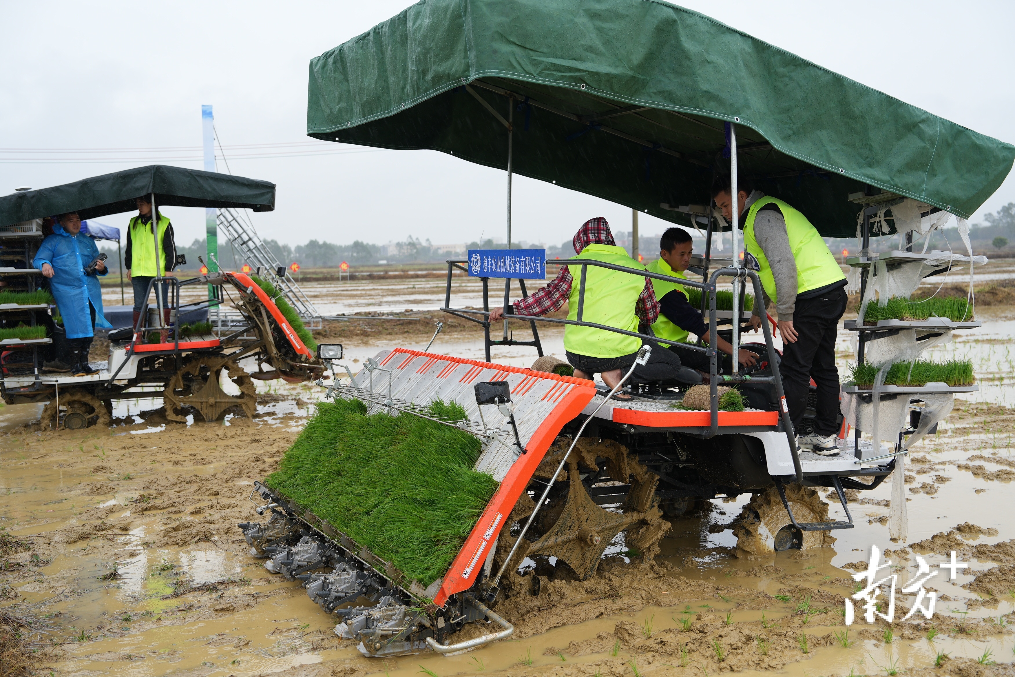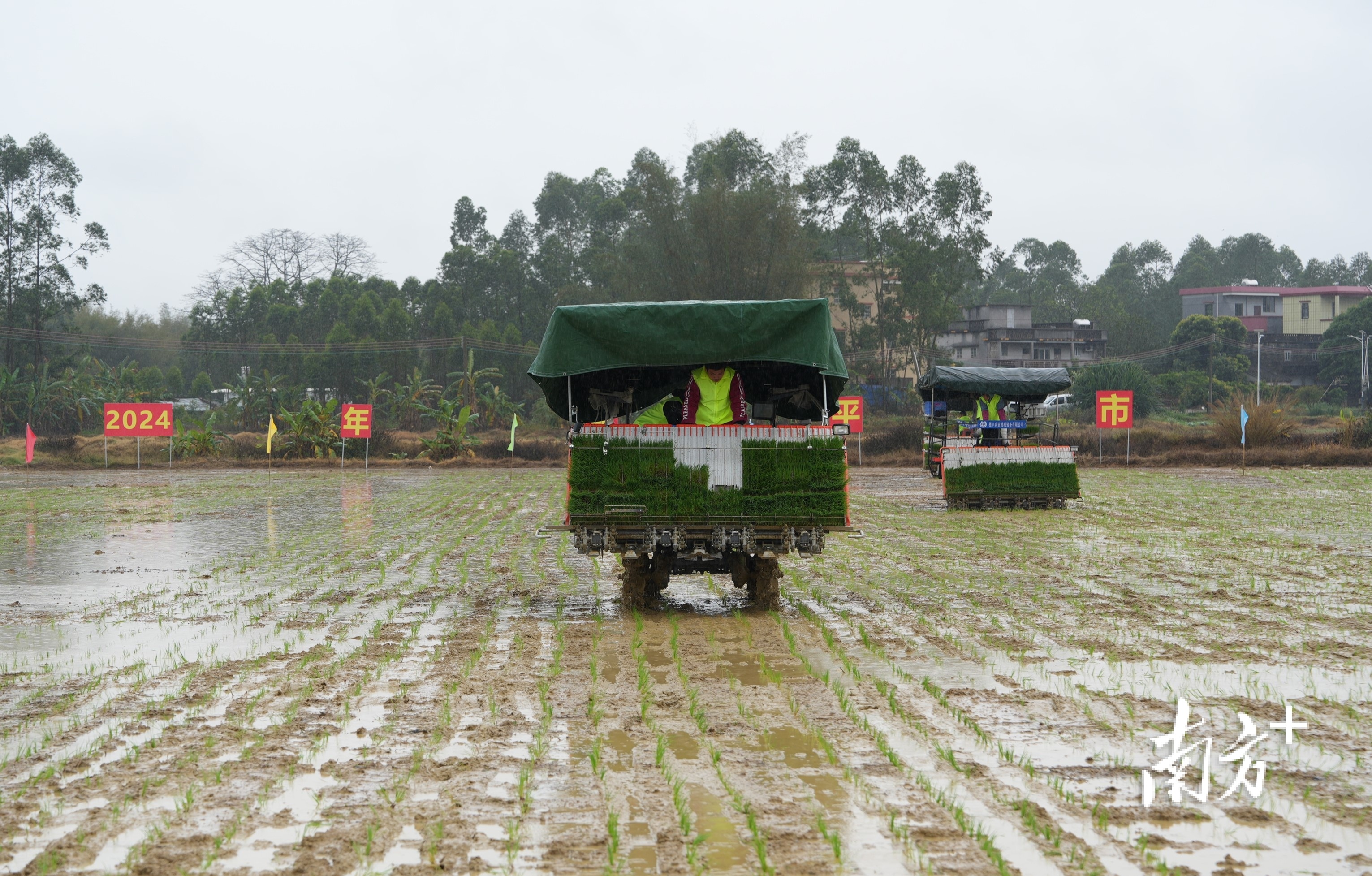 稻田间摆擂台,农机手大比武。当天,8支队伍驾驶插秧机同“田”竞技,比拼谁能又快又好地栽好秧苗,专家则根据栽插整体效果、漏插率、深度合格率等指标进行评分。只见片刻,一排排嫩绿的秧苗就齐刷刷地立在稻田中,在绵绵春雨里展现勃勃生机。