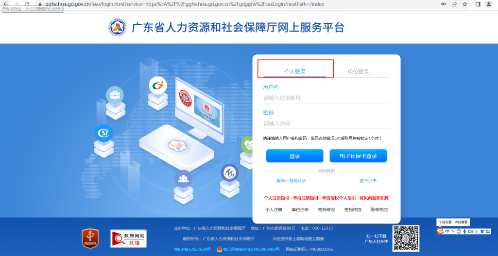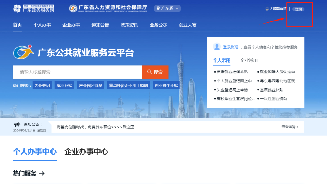 一、登陆“广东公共就业服务云平台”求职人员点击“个人登录”;