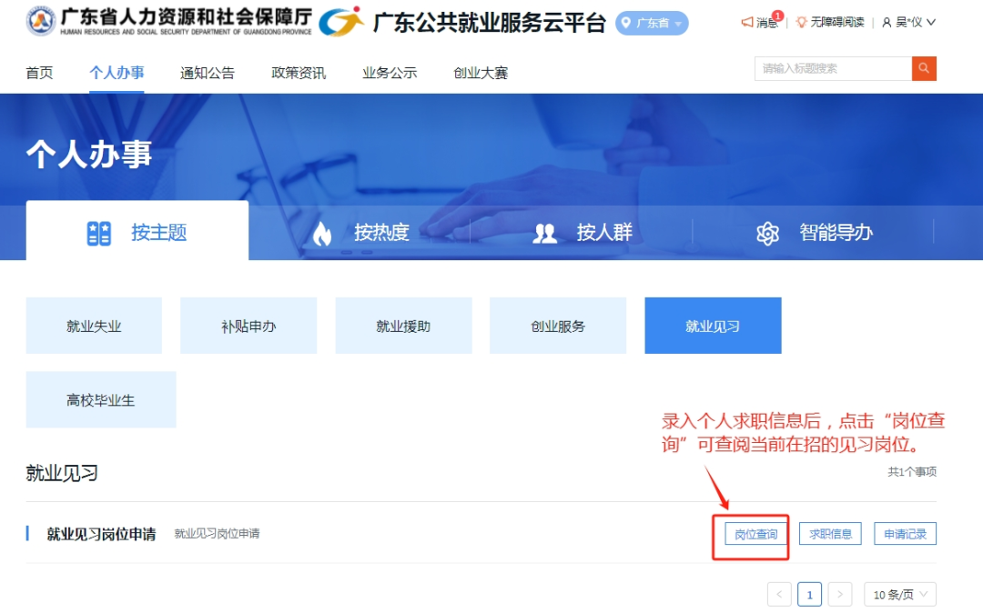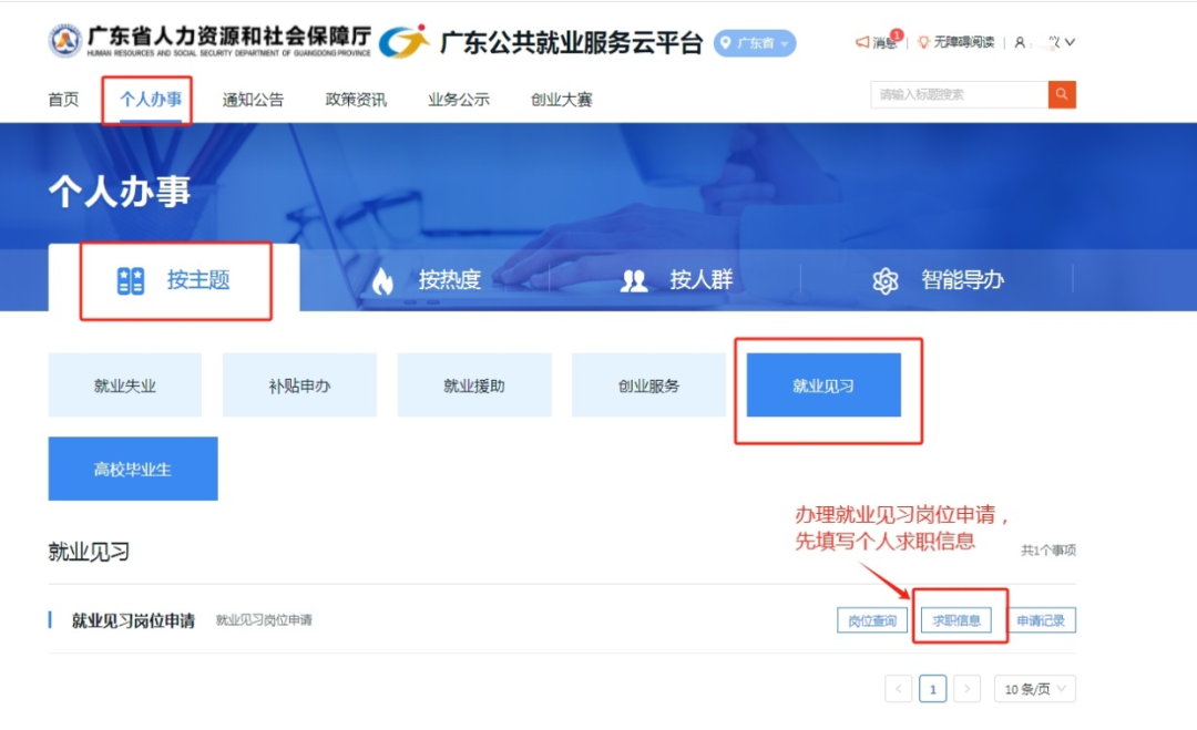 二、点击【个人办事】,按主题,点击【就业见习】;