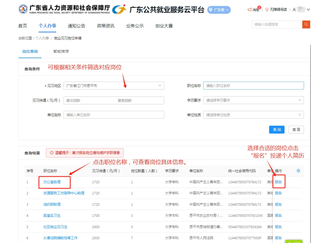 五、进入【岗位查询】后,可输入相关条件搜索岗位信息,点击“职位名称”可查看见习岗位详细信息,点击报名可投递个人简历;