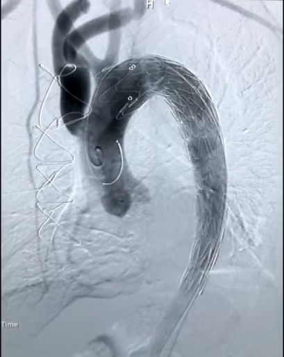 但是,“杂交手术”对医护团队配合度的要求非常高,需要外科手术与内科介入的无缝连接。首先,由心脏外科谢少波主任、王凯教授团队先为王先生实施了全麻下“右锁骨下动脉转流+左锁骨下动脉转流”,利用一根“Y”型人工血管将左、右锁骨下动脉与升主动脉相连接,完成双侧锁骨下动脉重建,确保患者双侧上肢的血供。