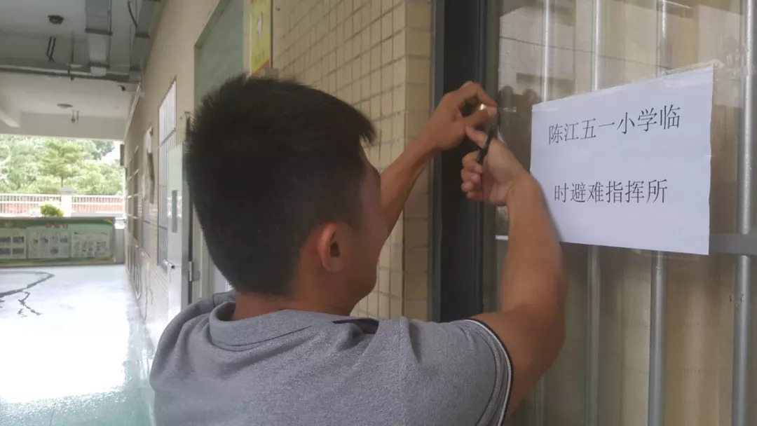 仲恺5·1小学成立了临时现场防台风应急领导小组。打开大门,能够收容任何人进入,准备了充足饮水和食物,安排好了基本生活保障及救助。