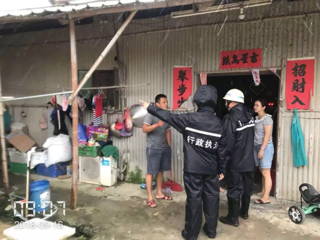 沥林执法队排查“山竹”台风隐患及劝离群众。