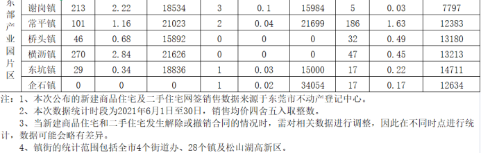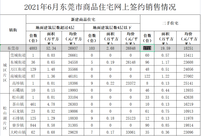 近日,《2021年6月东莞市商品住宅网上签约销售情况》新鲜出炉,6月,东莞市新建商品住宅签约套数4986套。其中,东莞市新建商品住宅地面建筑层数超过4层的均价为26937元/平方米,共销售4883套;地面建筑层数4层以下的均价为26848元/平方米,共销售103套。二手住宅均价为18251元/平方米,共销售1713套。