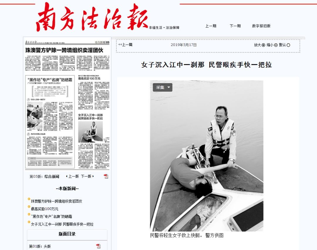 5月4日9时58分,水上派出所接到110指令,在博罗县罗阳街道东江大桥对面水桥下,有一名女子跳入东江轻生,要求该所出警出船救援。该所所长叶剑锋马上将值班人员分成两组,一组由其带领驾车赶赴现场组织救援,另一组由该所教导员李国良带领驾驶执法船舶以最快速度赶到事发江面施救,并通知120救护车到场待命。