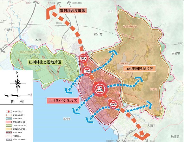 实际上,这里真的是在打造一个连片发展的省级新农村建设示范区。看点在于这里“山海交融、四星联珠”的规划,将稔山镇范和村、芙蓉村、长排村、大墩村4个行政村成片连线。据介绍是借用了古人“蛇山杆秤”的吉祥寓意,联动四村,构建四星联珠发展格局。古人将蛇山山脉称为一杆秤,秤头在蛇山,秤尾在金山岭,稔山大鱼塘为秤盘,范和石戏台为秤砣,山脚下长排、大墩、范和、芙蓉等村为秤星,如此“维系”一方祥和安宁。取名“四星联珠”,为祥瑞之兆。