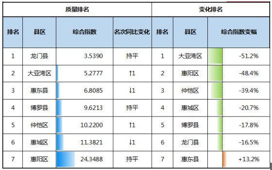 按照空气质量综合指数排名,1月空气质量由好到差依次排名为龙门县、大亚湾区、惠东县、惠阳区、仲恺区、惠城区、博罗县。与2018年同期相比,博罗县、大亚湾区2个县区空气质量有所改善;龙门县、惠东县、惠阳区、惠城区、仲恺区等5个县区空气质量有所变差。