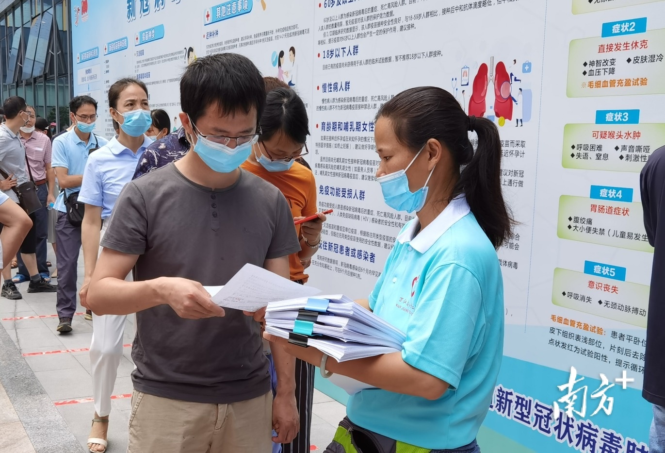 在接种区外的等候区,志愿者、社区干部们正积极引导群众排队接种、文明等候。恰逢雨天,有负责户外工作的志愿者穿着薄薄的雨衣来回奔走,有的则向排队群众发放并指导填写知情同意书,对一些老年接种者,基本是工作人员“一对一”帮助填写。