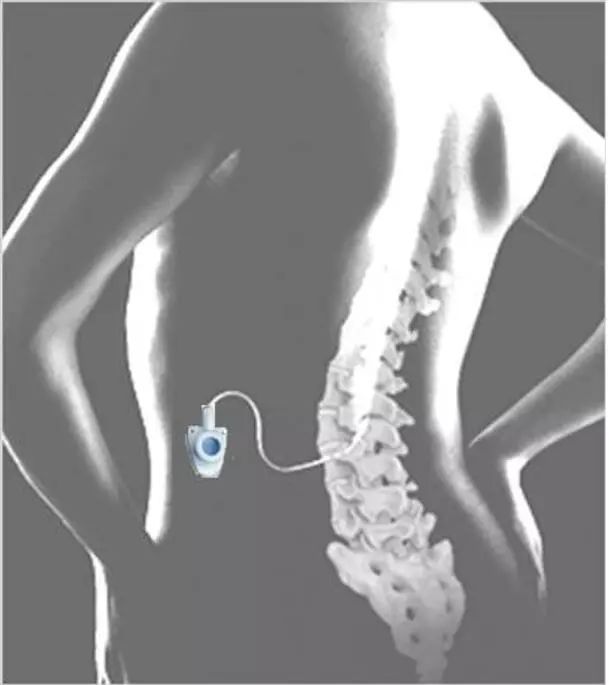 在患者体外的全智能镇痛泵与植入体内的输液港进行连接后,可以让止痛药直接顺皮肤和导管进入患者脊柱内,从而使止痛药直接作用于脊髓和中枢神经。
