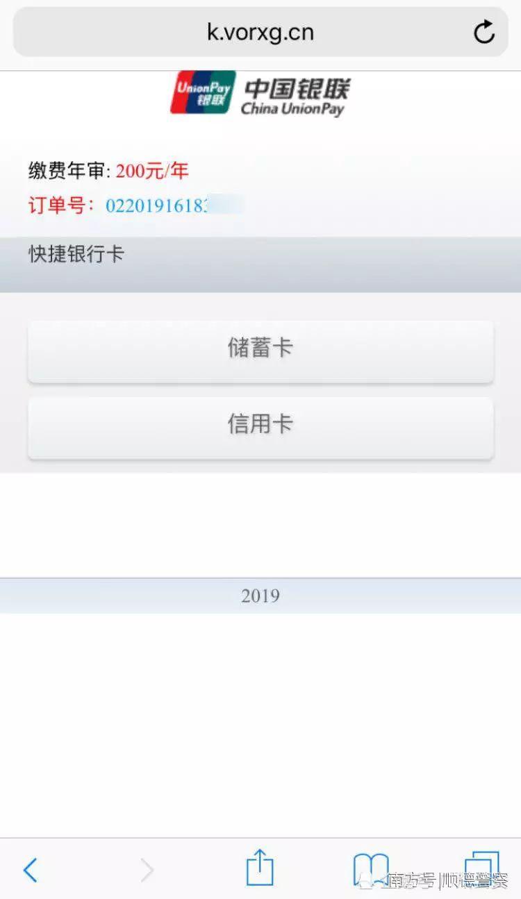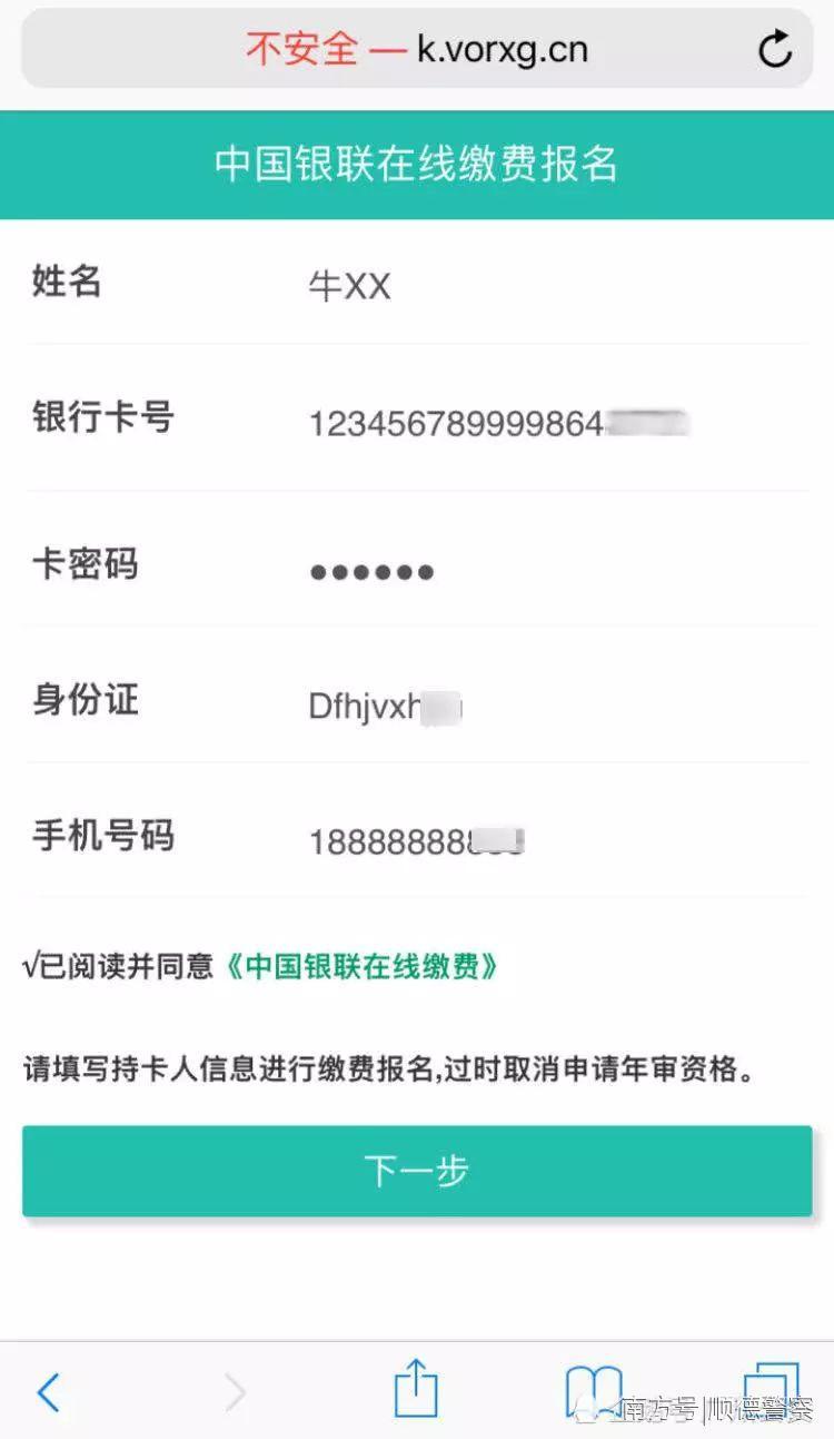 第四步:在伪造的“中国银联”网页中显示“缴费年审:200/年”,并提示选择“储蓄卡”或“信用卡”。点击进入后,要求填写姓名、银行卡号、卡密码、身份证、手机号码。此时,不法分子通过钓鱼网站在后台实时套取到事主的个人基本信息和银行卡信息,进而盗刷事主资金。