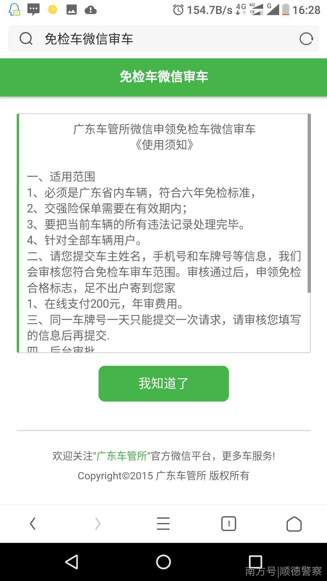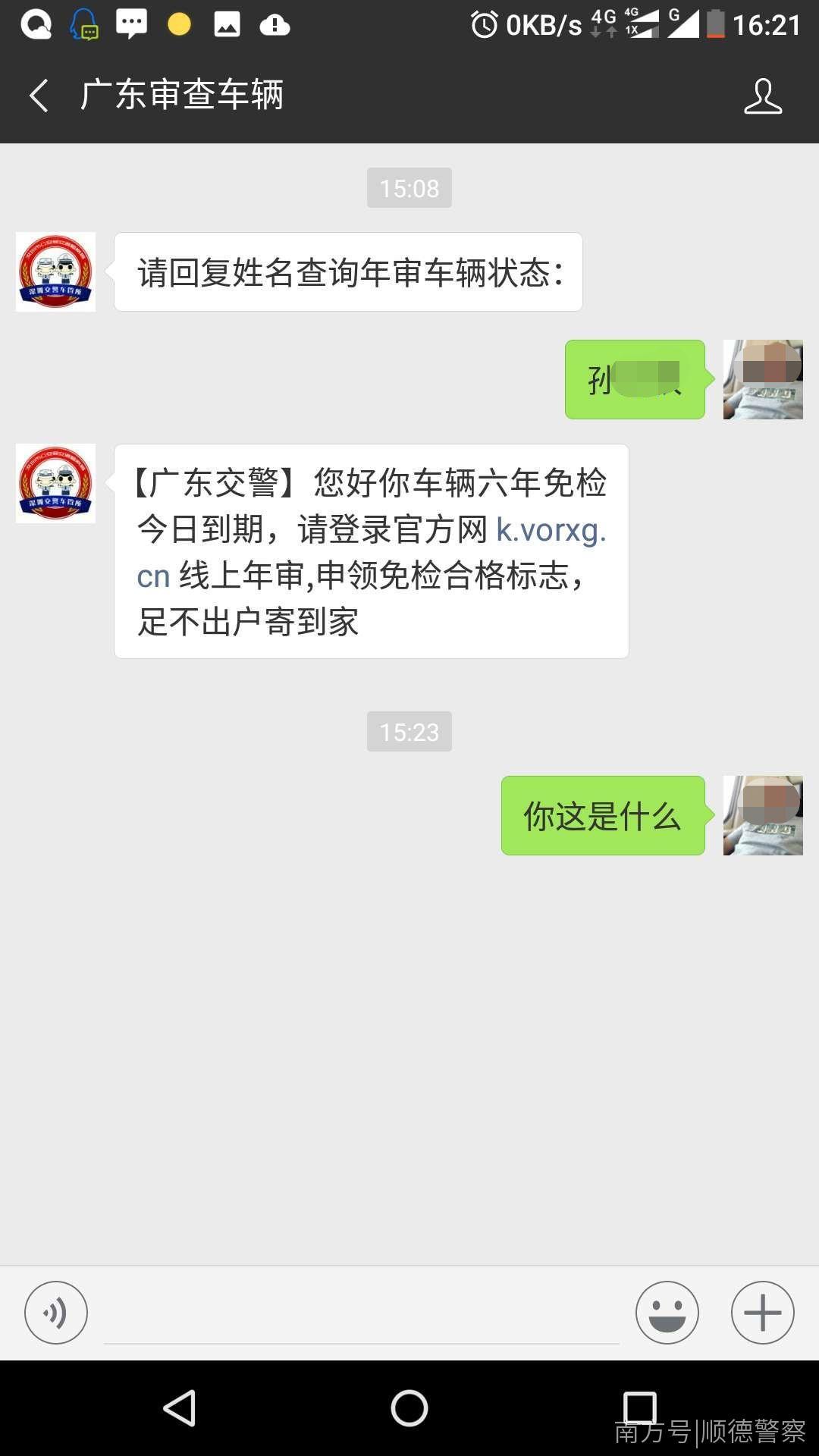第二步:事主通过微信搜索“广东车辆核审”并关注后,微信中出现“请回复姓名查询年审车辆状态”。此时,无论回复杜撰的姓名或车牌,微信中都会弹出“【广东交警】您好,您的车辆六年免检今日到期,请登录官方网k.vorxg.cn(短信链接另有m.qichejt.cn,均为钓鱼网站)线上年审,申领免检合格标志,足不出户寄到家”的内容。