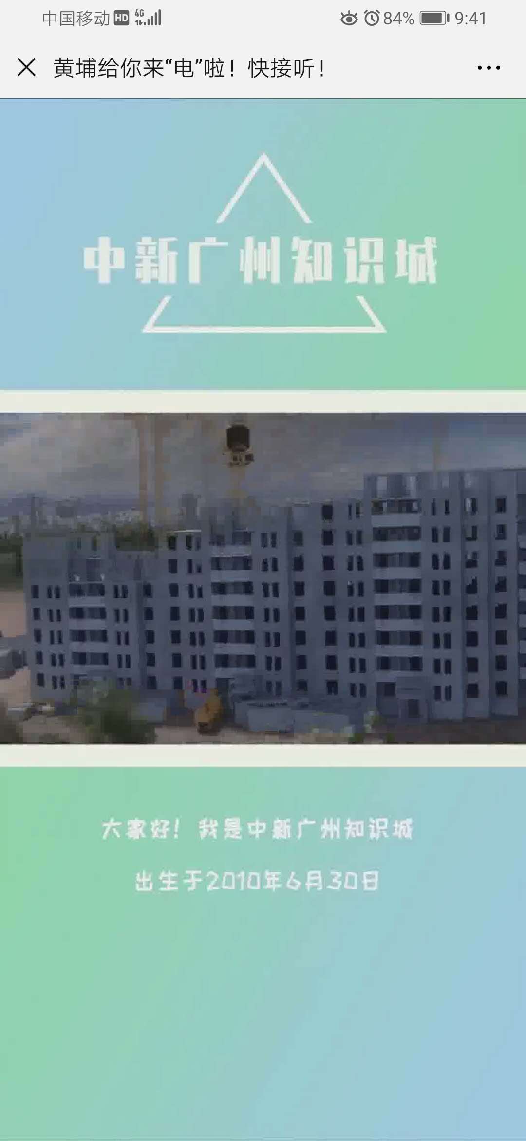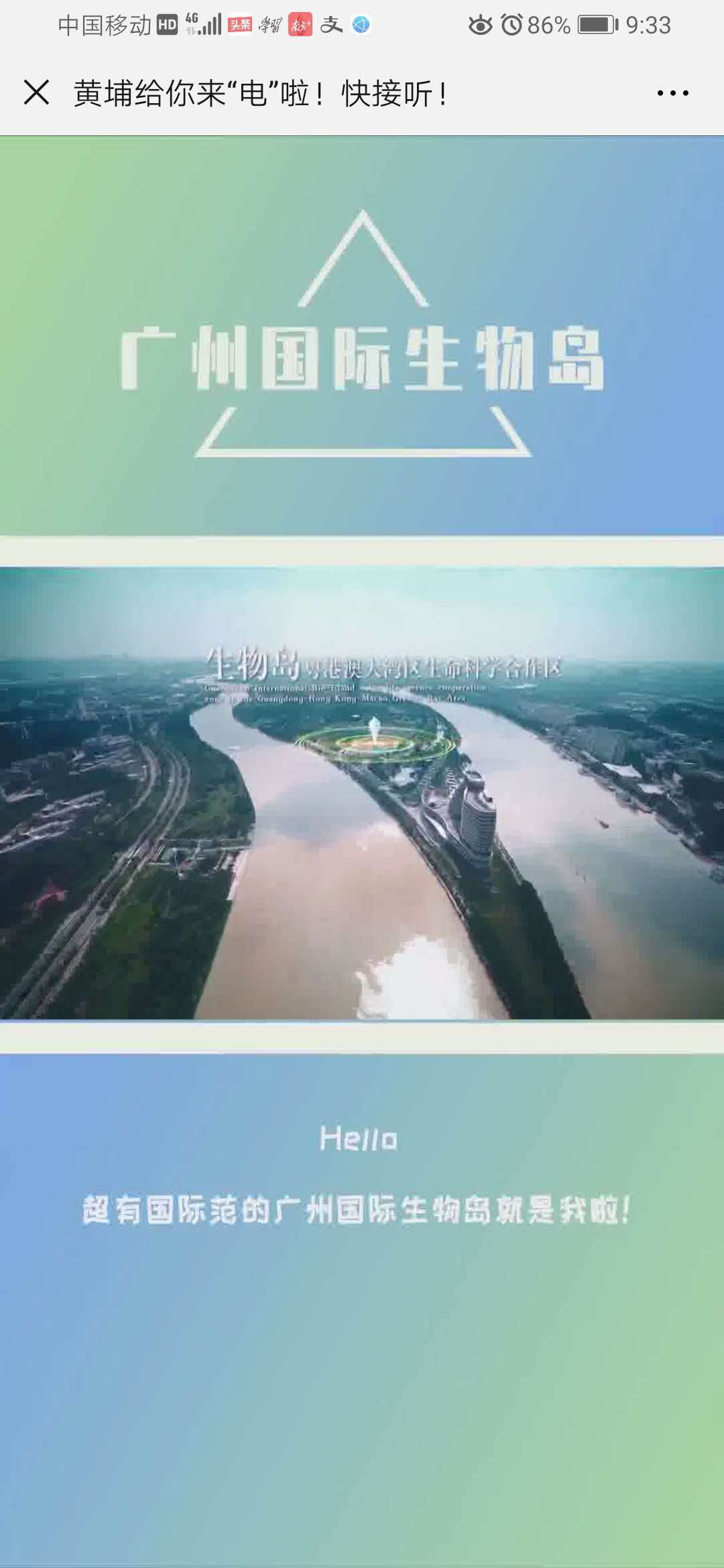 H5利用多个“视频通话”的场景,嵌入4段视频;分别用拟人的手法,介绍了中新广州知识城、广州科学城、黄埔港和广州国际生物岛,全方位展现了各自的优势,以及其在粤港澳大湾区建设中的目标和决心。