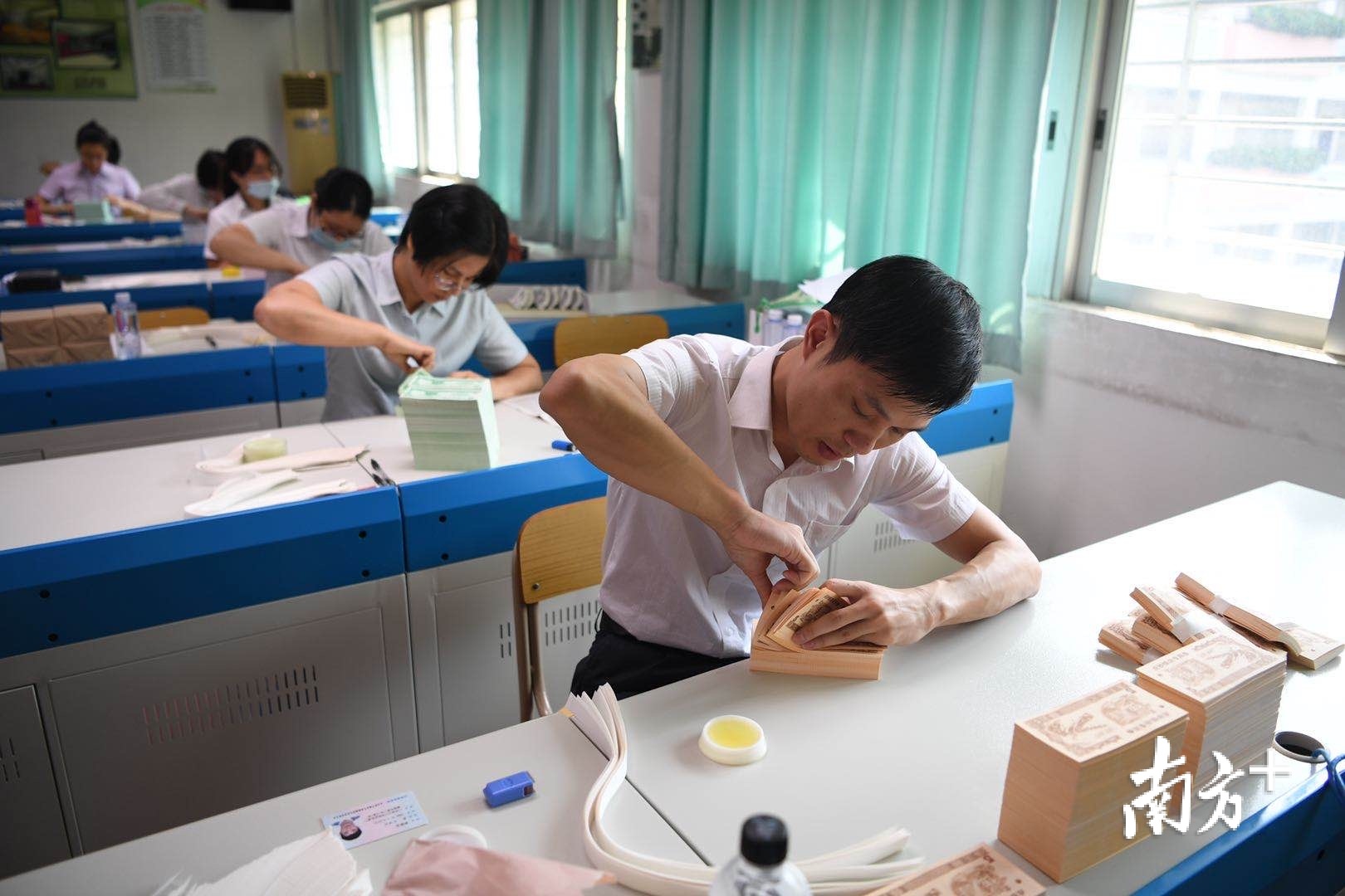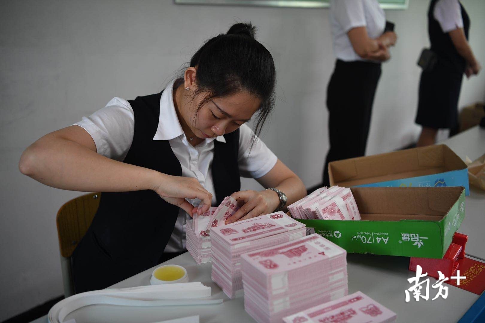 点钞比赛,现场传来哗啦啦的数“钱”声。