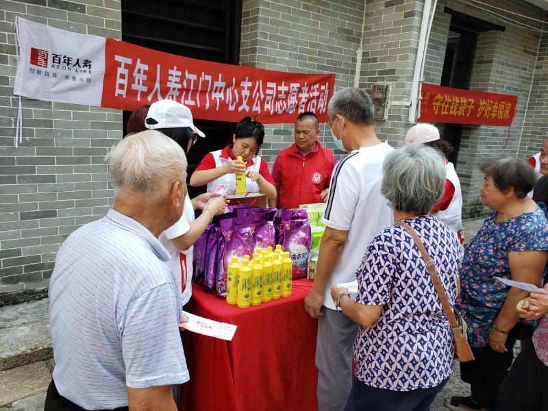 近日,百年人寿江门中心支公司(下称“江门百年人寿”)志愿者服务队携手江门市蓬江区墟顶社区,联合开展“初夏·暖心”志愿者慰问及金融防诈教育宣传活动,为社区老人送上关怀与金融服务。