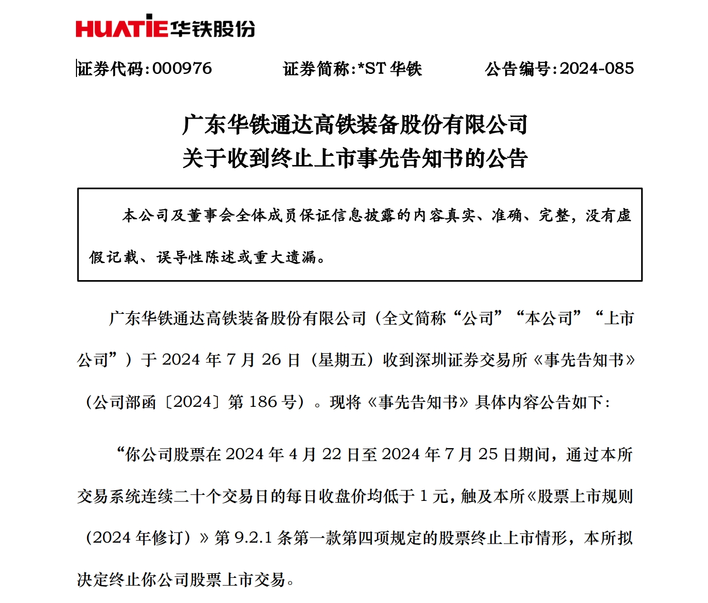 7月31日,南方+记者获悉,*ST华铁公告,其股票在2024年4月22日至2024年7月25日期间,通过深圳证券交易所交易系统连续二十个交易日的每日收盘价均低于1元,根据相关规定,深交所将终止公司股票上市。