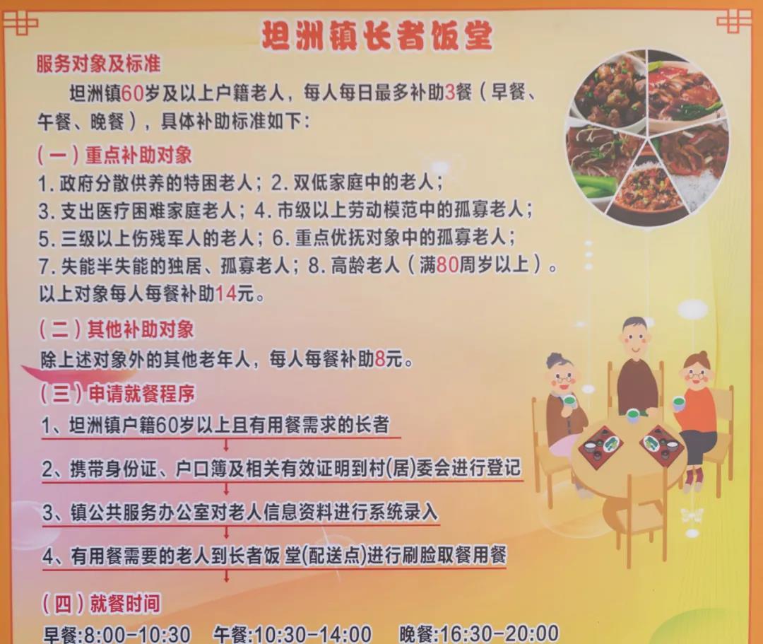1、用餐标准。金斗酒家开设的镇级“长者饭堂”餐标为14元,新合村 “周来海鲜饭店” 餐标为13元,坦洲镇党委、政府加大补贴力度,从原先的4元提升至8元每餐。分散供养的特困老人、双低家庭的老人等困难老人可免费享用,普通老人则支付6元左右。