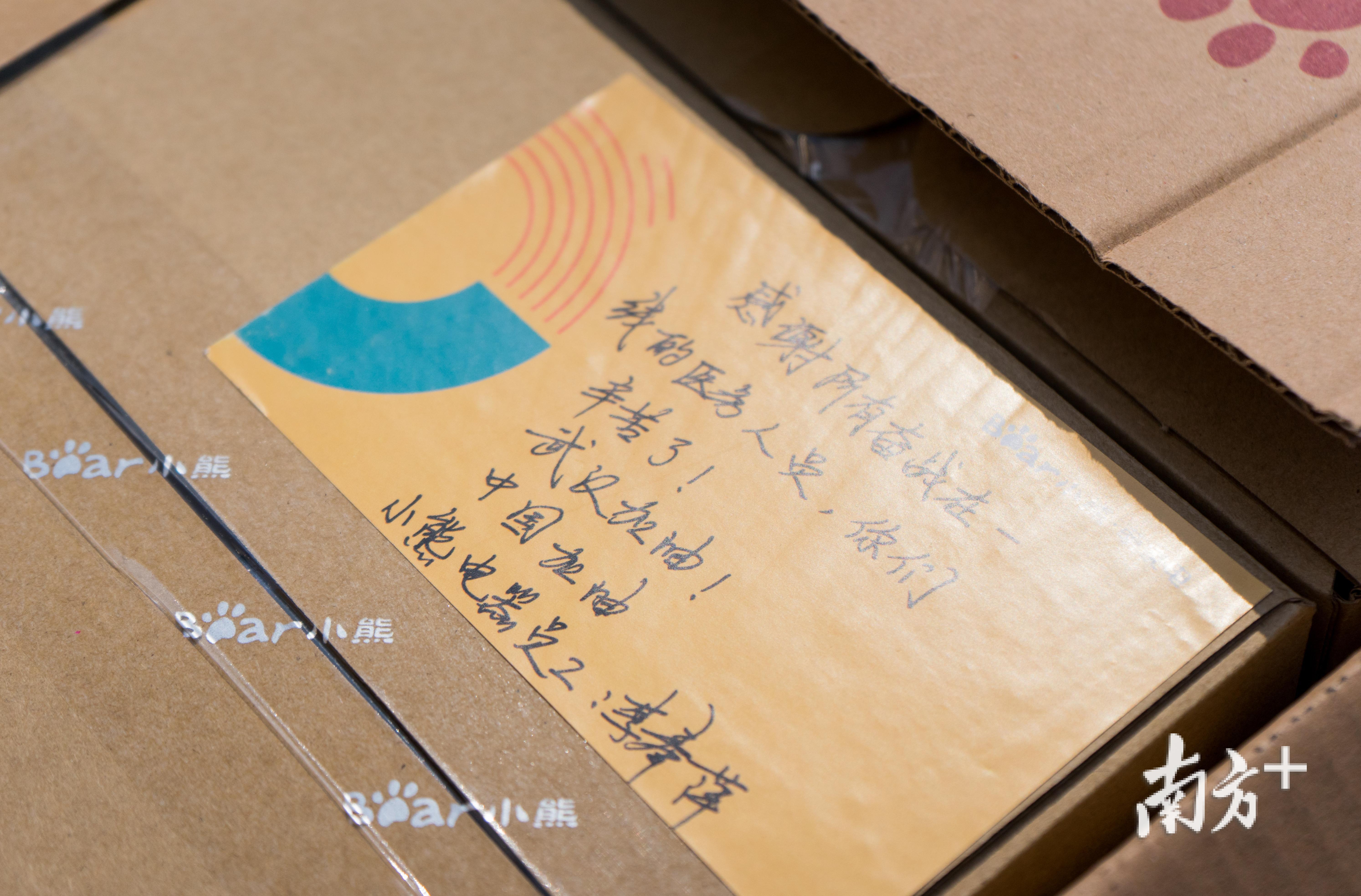 “辛苦了!”“武汉加油!”这1万台产品,每一台的外包装上都张贴有小熊电器员工亲笔写下的鼓励标签,包括小熊电器董事长李一峰在内。