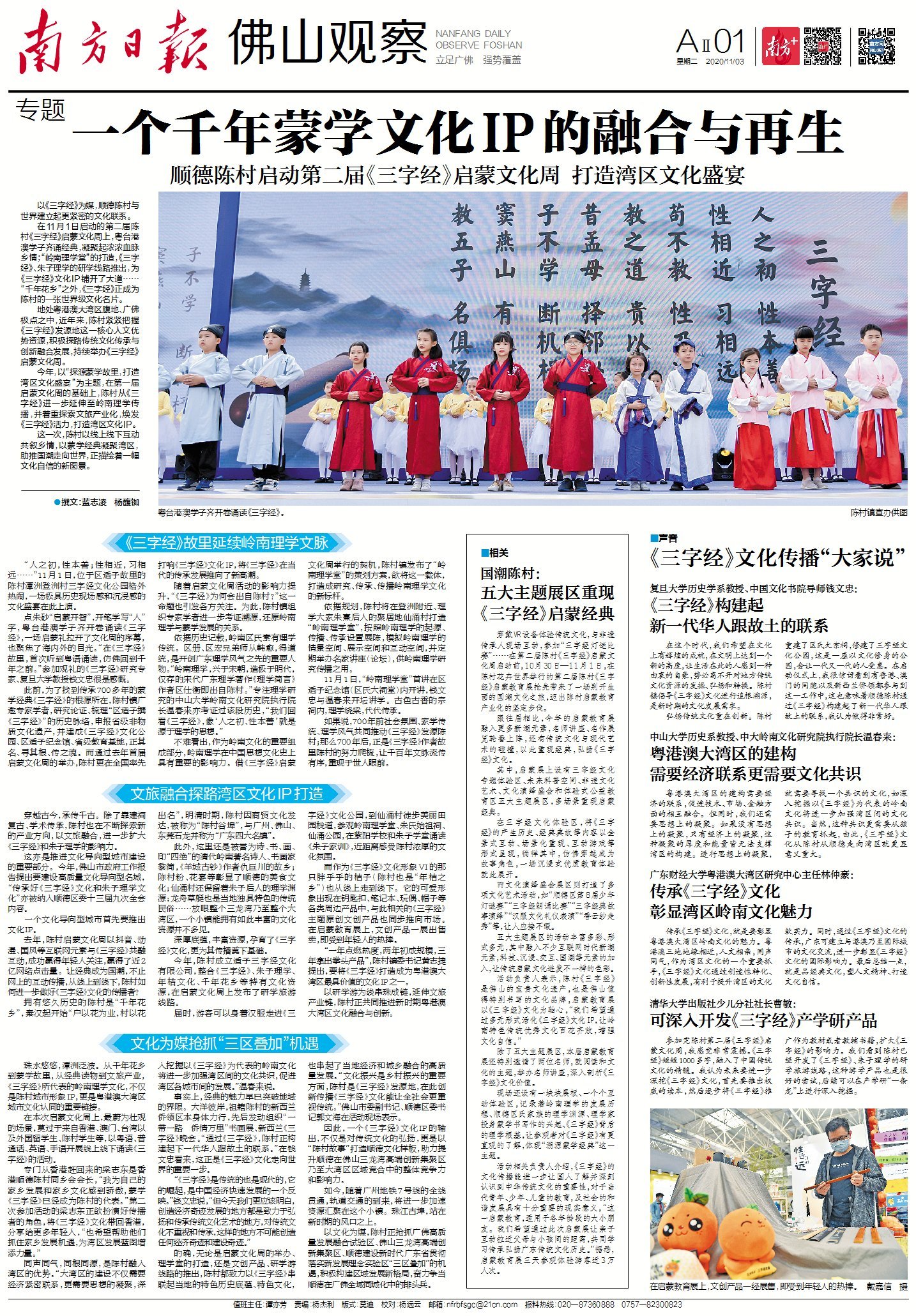 在11月1日启动的第二届陈村《三字经》启蒙文化周上,粤台港澳学子齐诵经典,凝聚起浓浓血脉乡情;“岭南理学堂”的打造,《三字经》、朱子理学的研学线路推出,为《三字经》文化IP铺开了大道……“千年花乡”之外,《三字经》正成为陈村的一张世界级文化名片。