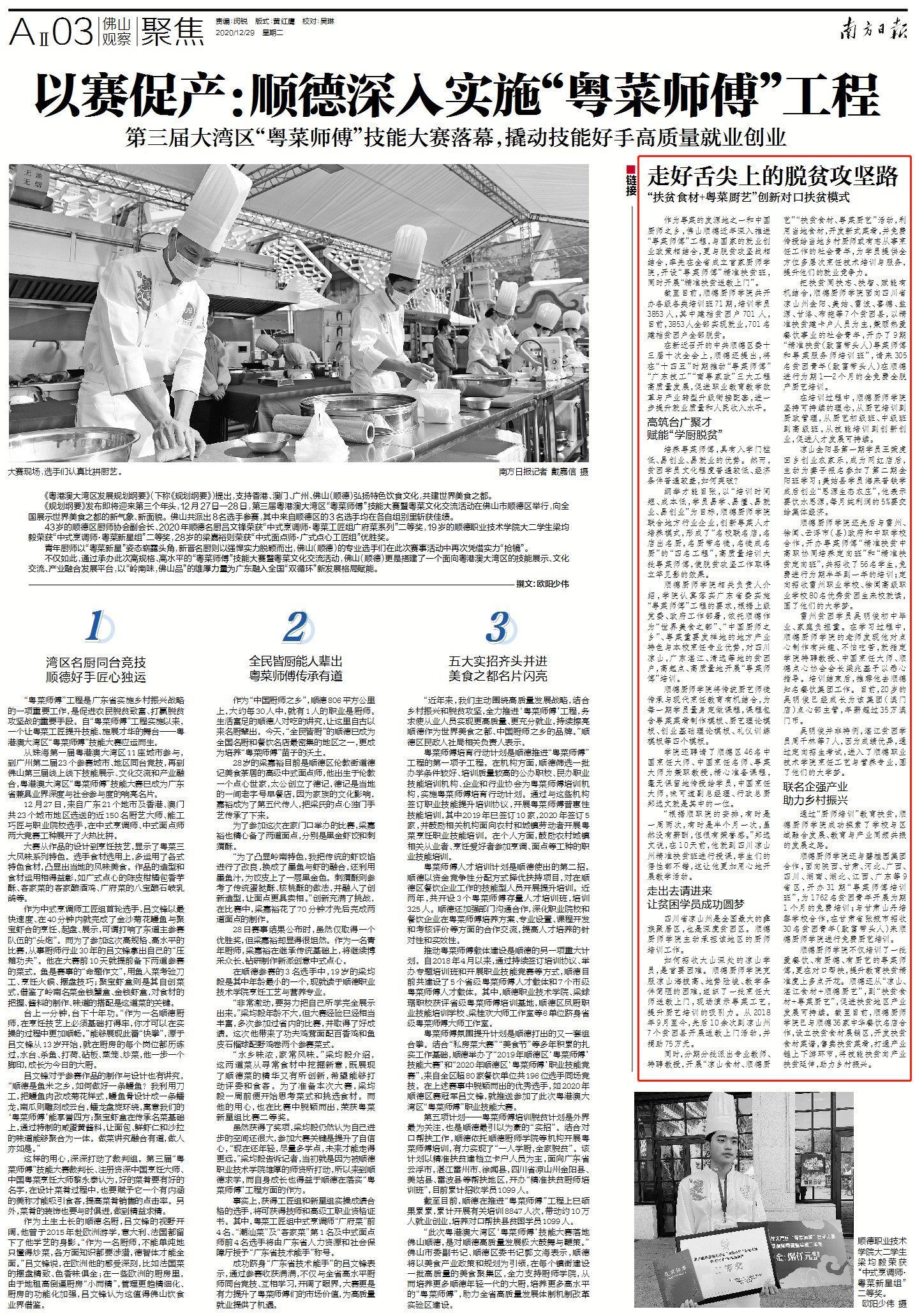 在新近召开的中共顺德区委十三届十次全会上,顺德还提出,将在“十四五”时期推动“粤菜师傅”“广东技工”“南粤家政”三大工程高质量发展,促进职业教育教学改革与产业转型升级衔接配套,进一步提升就业质量和人民收入水平。