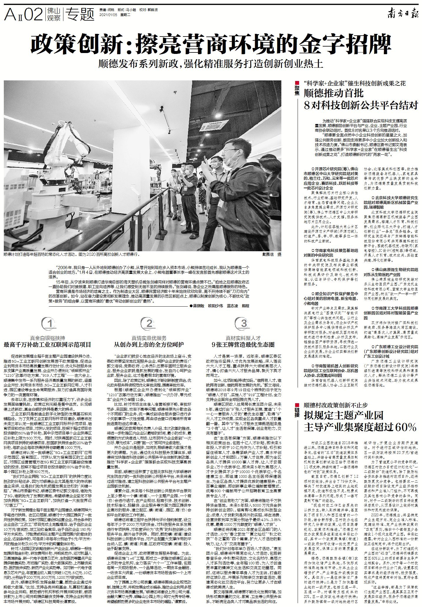 促进新发展理念超千亩主题产业园建设扶持办法、推进5G+工业互联网创新发展若干政策措施、促进企业利用资本市场高质量发展行动计划、优化科技服务体系支撑产业高质量发展、企业开办便利化“领照即开业”“1210”改革行动方案、“919人才工程”……在大会上,顺德集中发布一系列服务经济高质量发展的新政,涵盖企业开放、利用资本市场、5G+工业互联网应用、人才引进、园区建设等全生命周期服务,努力打造具有国际竞争力的一流营商环境。