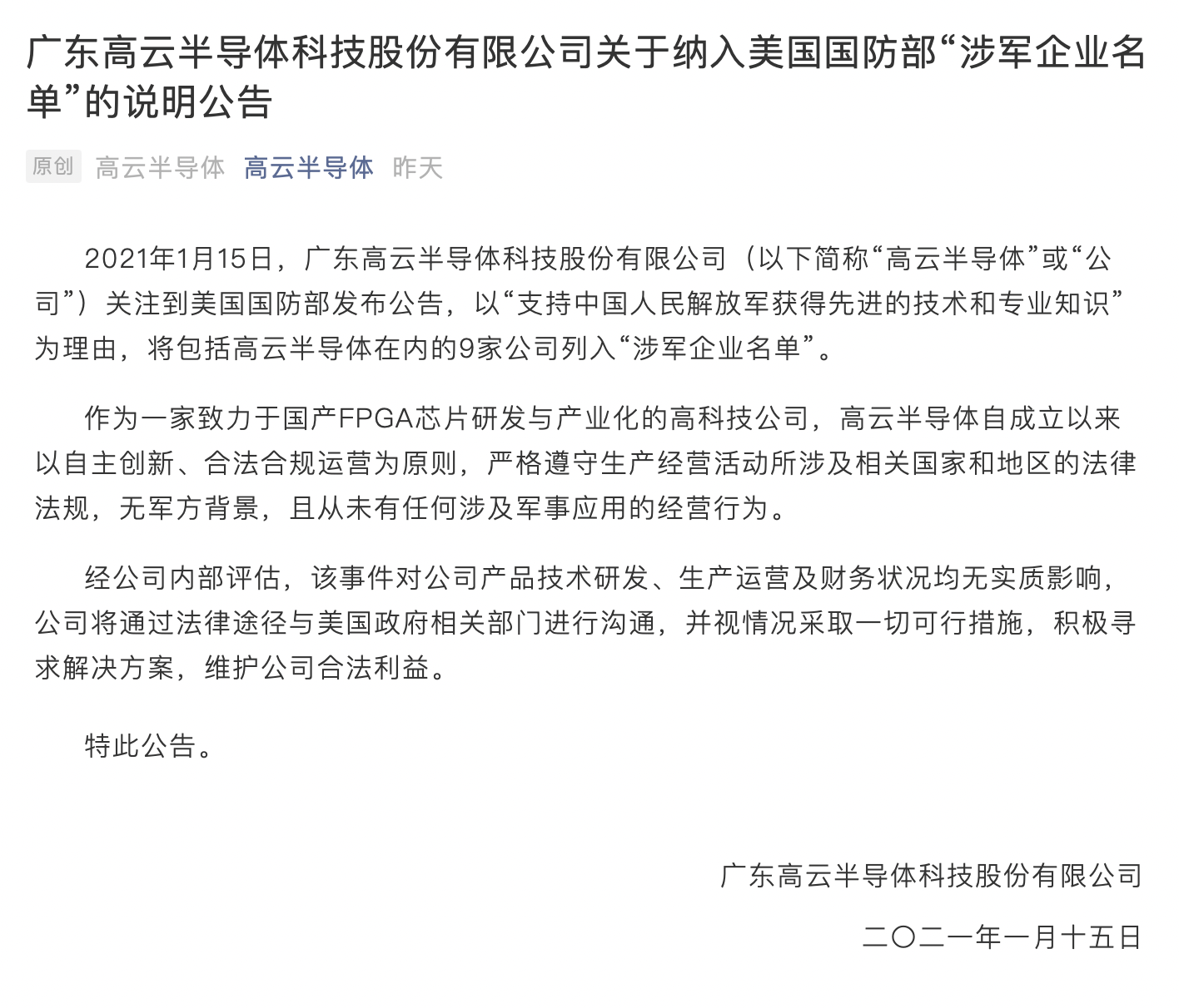 针对此次被列入“涉军企业名单”,高云半导体也于15日正式回应,称,高云半导体自成立以来以自主创新、合法合规运营为原则,严格遵守生产经营活动所涉及相关国家和地区的法律法规,无军方背景,且从未有任何涉及军事应用的经营行为。
