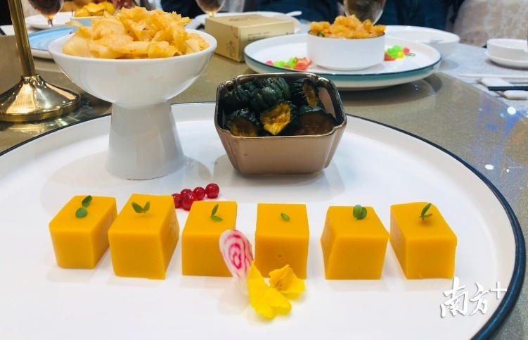 “粗料精做”是顺德菜的灵魂。当天的佛味全席宴会上,11道主菜从菜名就体现珍宝厨师们的用心:招牌无骨功夫猪、珍宝第一鸡、顺德拆鱼茸羹、鲜花椒广东特色蒸老虎斑、宫保椒香焗罗氏虾、油泼鲜鲍长寿鱼、章鱼堡淋黑毛节瓜、耗皇萝卜扣响螺片、十八涌莲藕炒酿羊肚菌、窝蛋肉碎石斛苗、顺德姜撞奶。