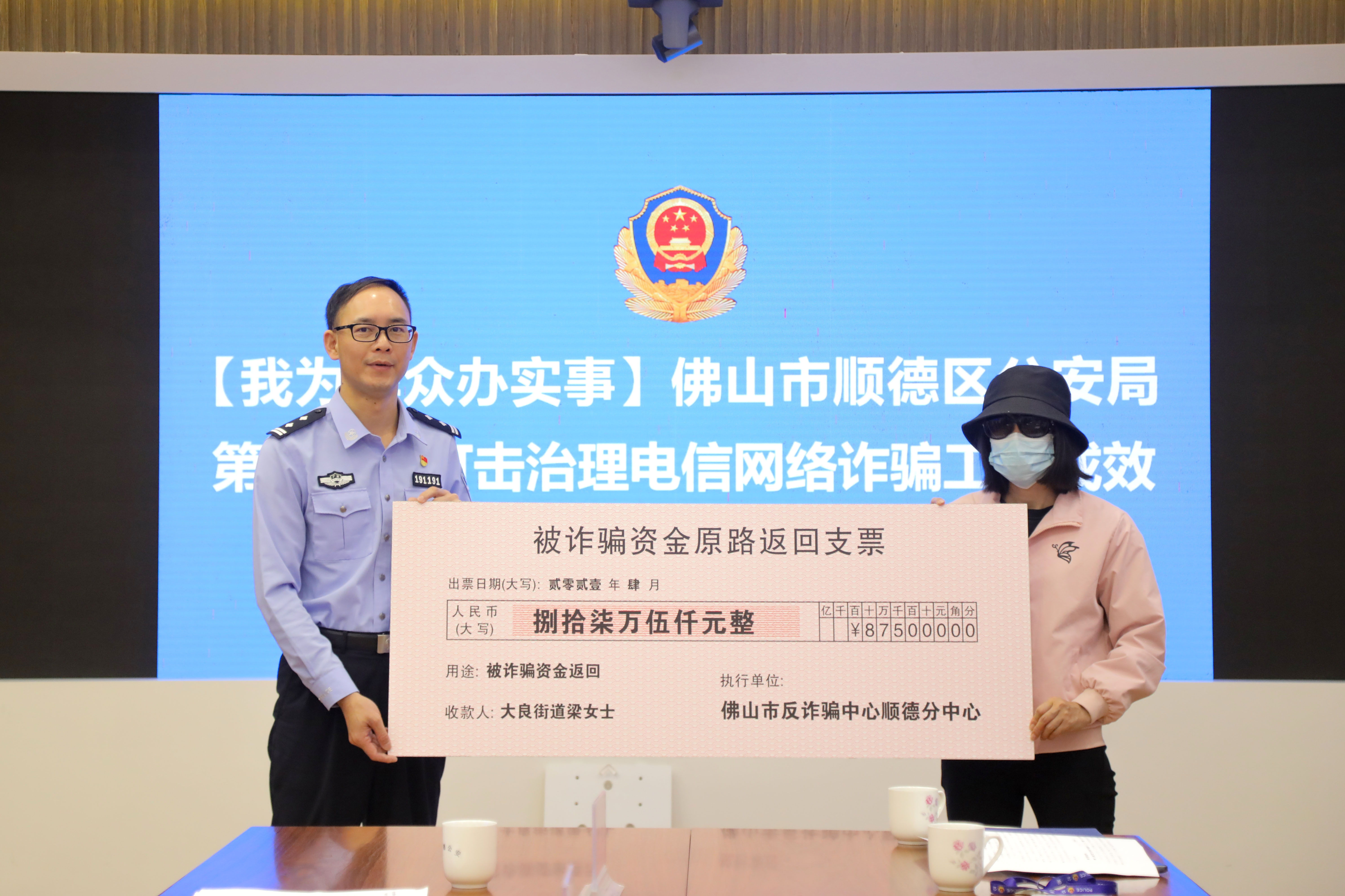 于是,警方迅速开展多方联动,在佛山市反诈中心,顺德分中心联合湖北恩施警方和相关银行后,及时对交易资金进行堵截,第一时间办理冻结手续,最终通过三级反诈中心的共同努力,被骗资金经返还机制原路返还,成功止付87.5万元。据介绍,此案件是今年以来返还金额最大的电诈案件。