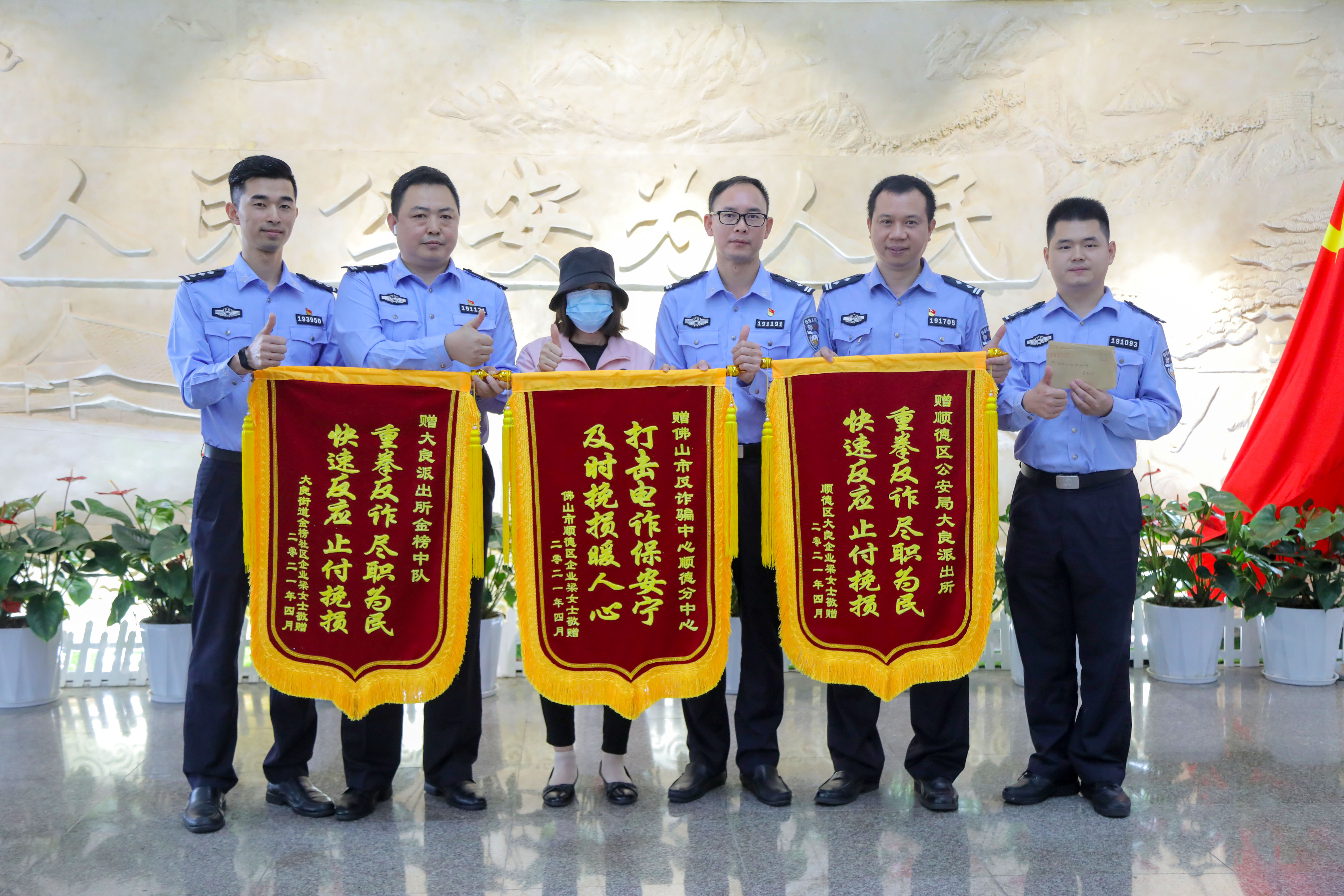 4月26日上午,佛山市顺德区公安局在第一季度打击治理电信网络诈骗工作成效新闻通报会上通报了该起案件,事主梁女士来到会场,将3面写着“打击电诈保安宁,及时挽损暖人心”“重拳反诈,尽职为民;快速反应,止付挽损”的锦旗和三封感谢信送到顺德区公安局刑侦大队教导员梁永龙和大良派出所办案民警手上,感激顺德警察全心全意为群众办实事。