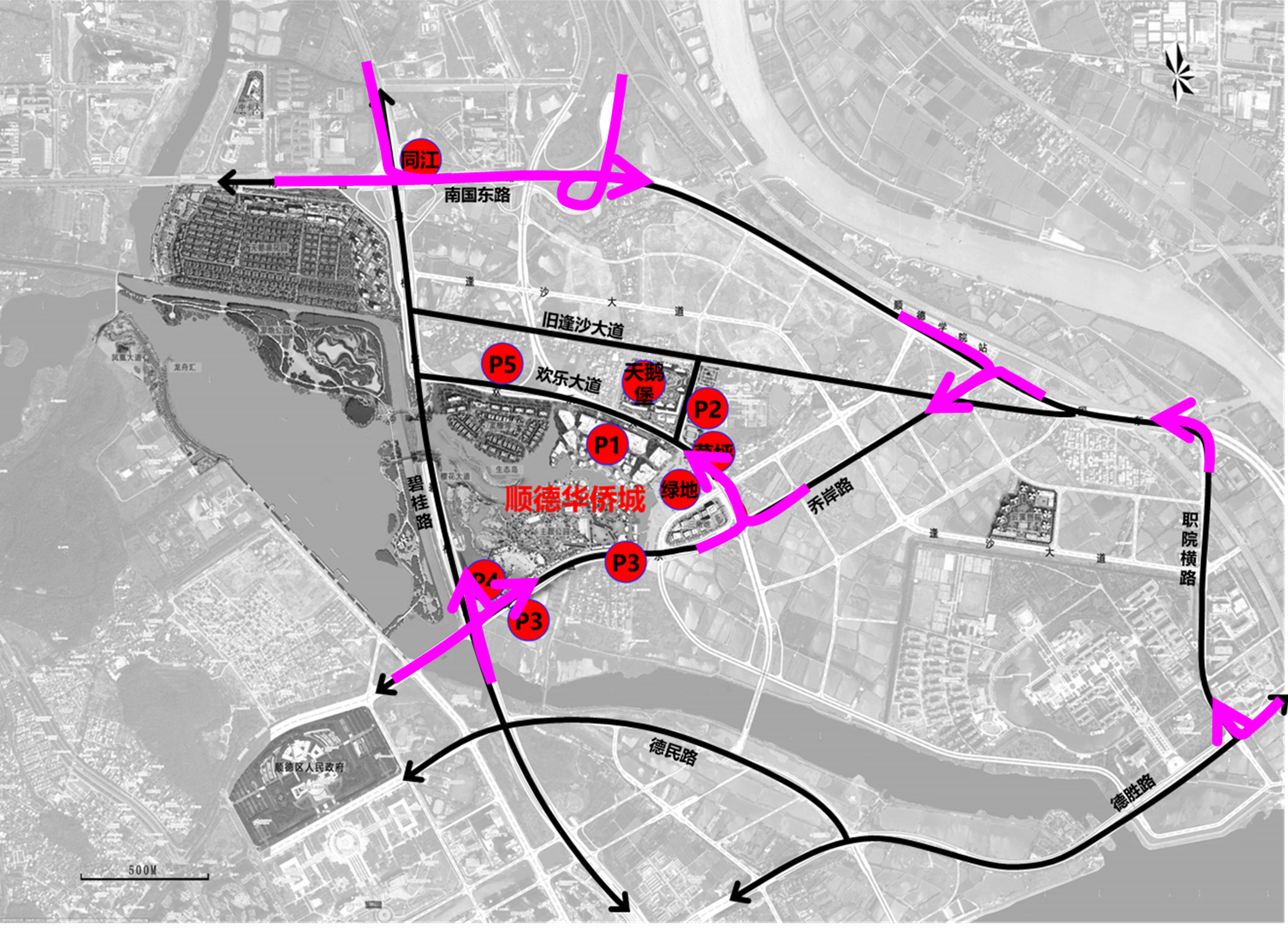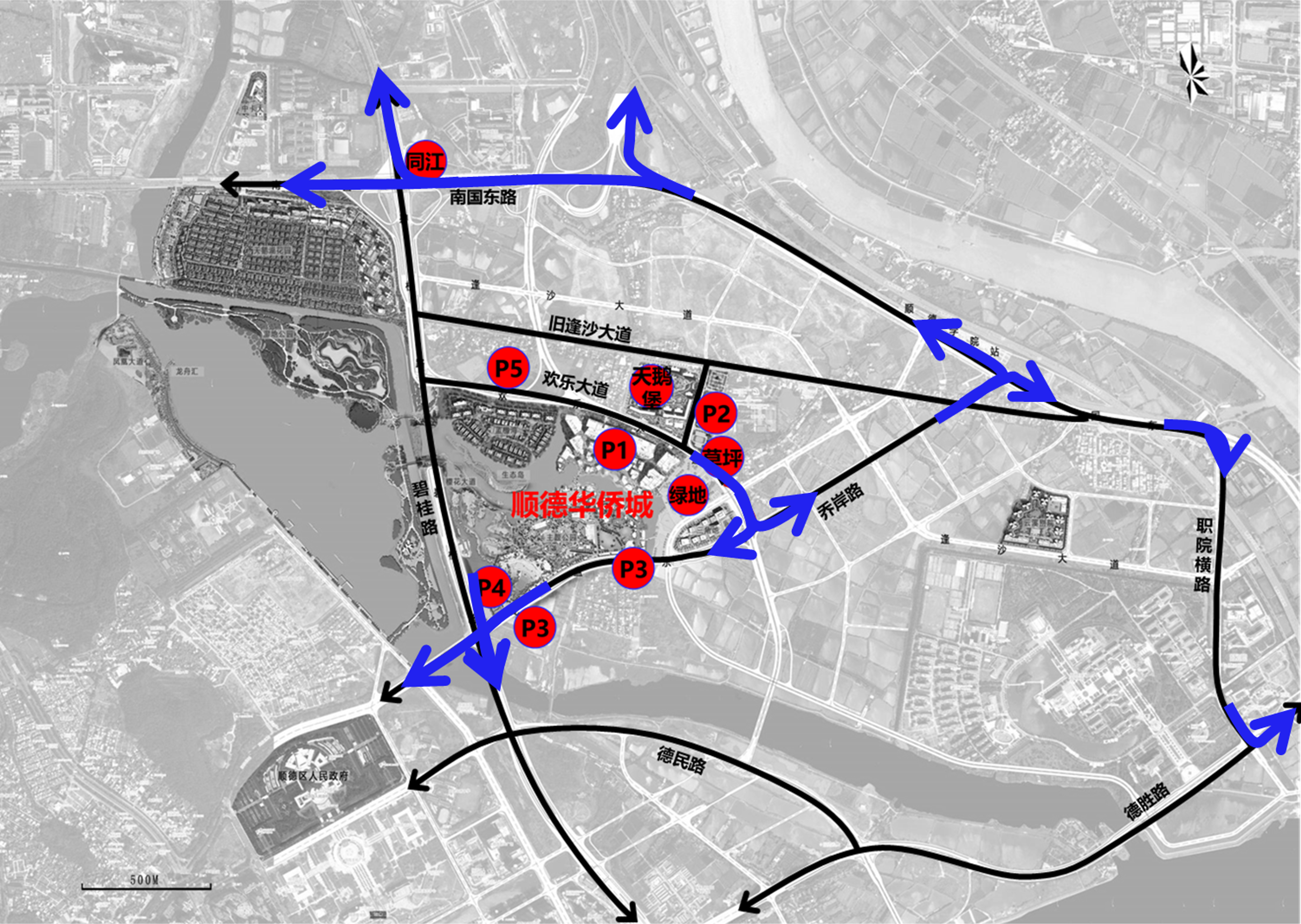 ●碧桂路(中山方向)/龙盘北路→停车场(P3停车场、P4停车场)[→龙盘北路东延线→欢乐大道→停车场( 新增草坪停车场、绿地停车场、P2停车场)]。