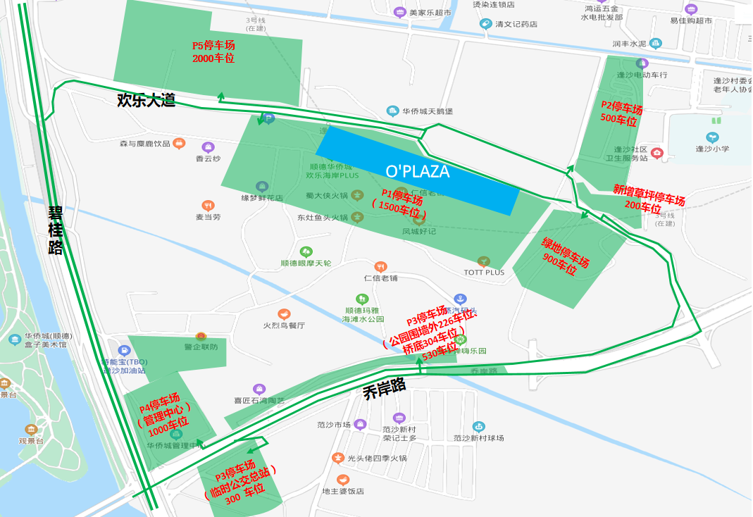 ●东新高速/顺番路→五沙大桥→德胜东路→职院横路→南国东路→乔岸路→欢乐大道→停车场(新增草坪停车场、绿地停车场、P2停车场) ;
