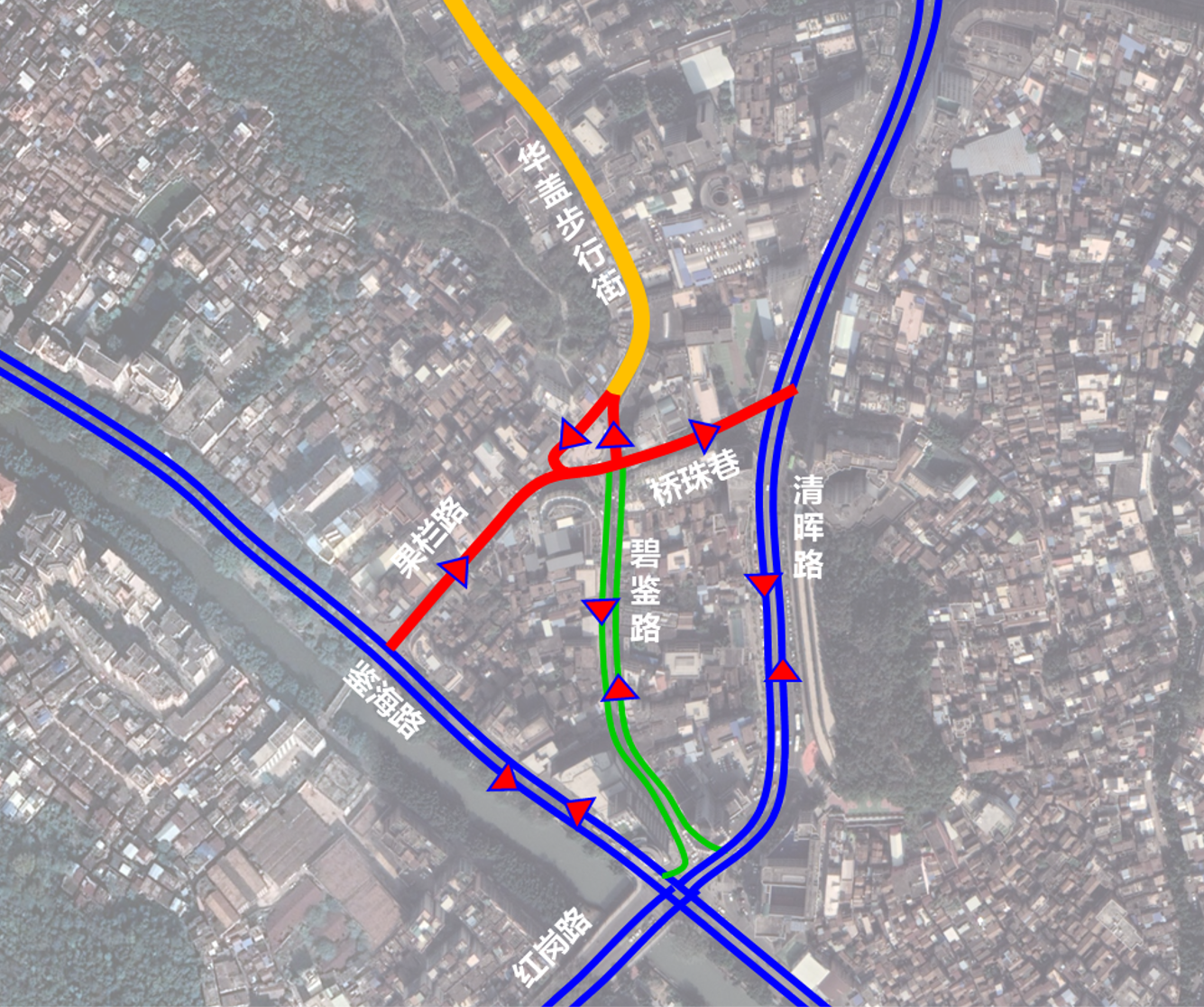 (3)交警部门因应交通高峰时段实施交通管制的需求,将果栏路、桥珠巷调整为西往东单行道路,围绕果栏路-桥珠巷-清晖路-鉴海路形成顺时针单向循环交通组织,碧鉴路保留双向通行。