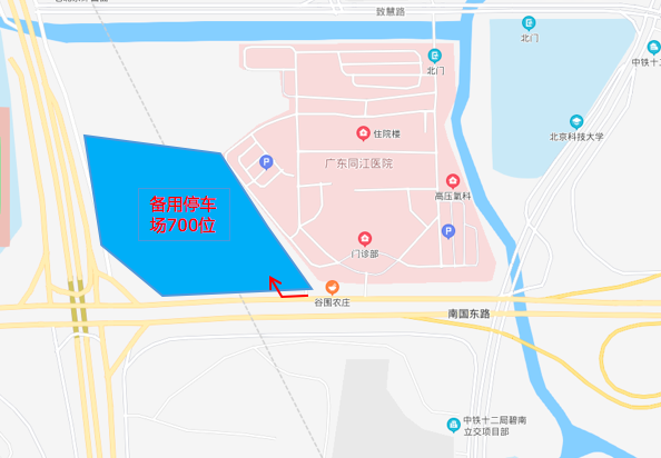 ●广珠西线高速→南国东路→停车场(同江医院旁备用停车场)[→南国东路→乔岸路→欢乐大道→停车场(新增草坪停车场、绿地停车场、P2停车场)];