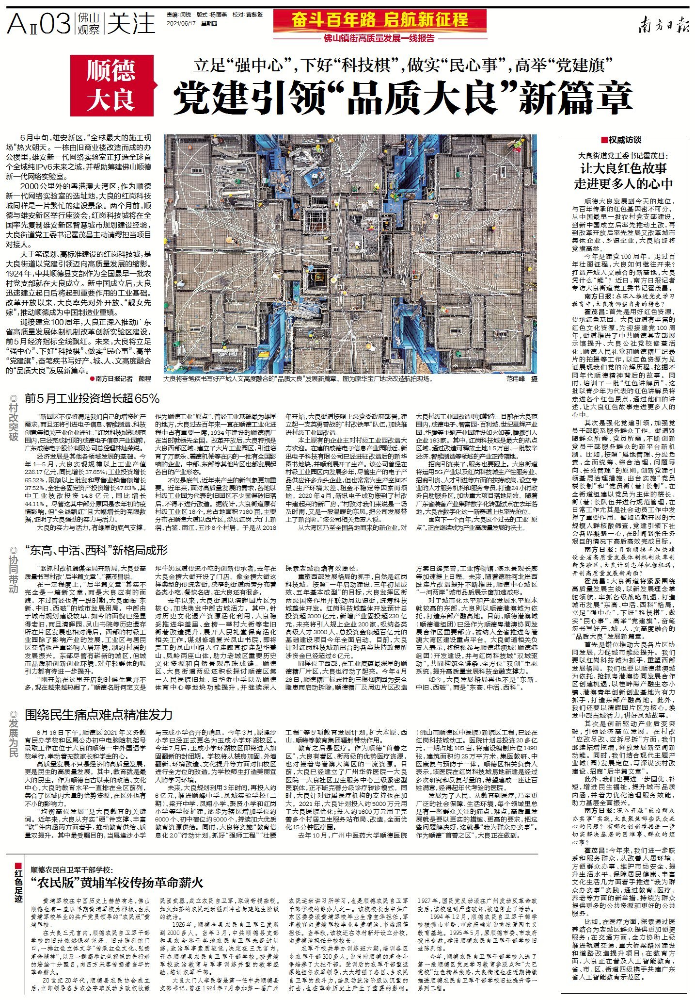 迎接建党100周年,大良正深入推动广东省高质量发展体制机制改革创新实验区建设,前5月经济指标全线飘红。未来,大良将立足“强中心”、下好“科技棋”、做实“民心事”、高举“党建旗”,奋笔疾书写好产、城、人、文高度融合的“品质大良”发展新篇章。