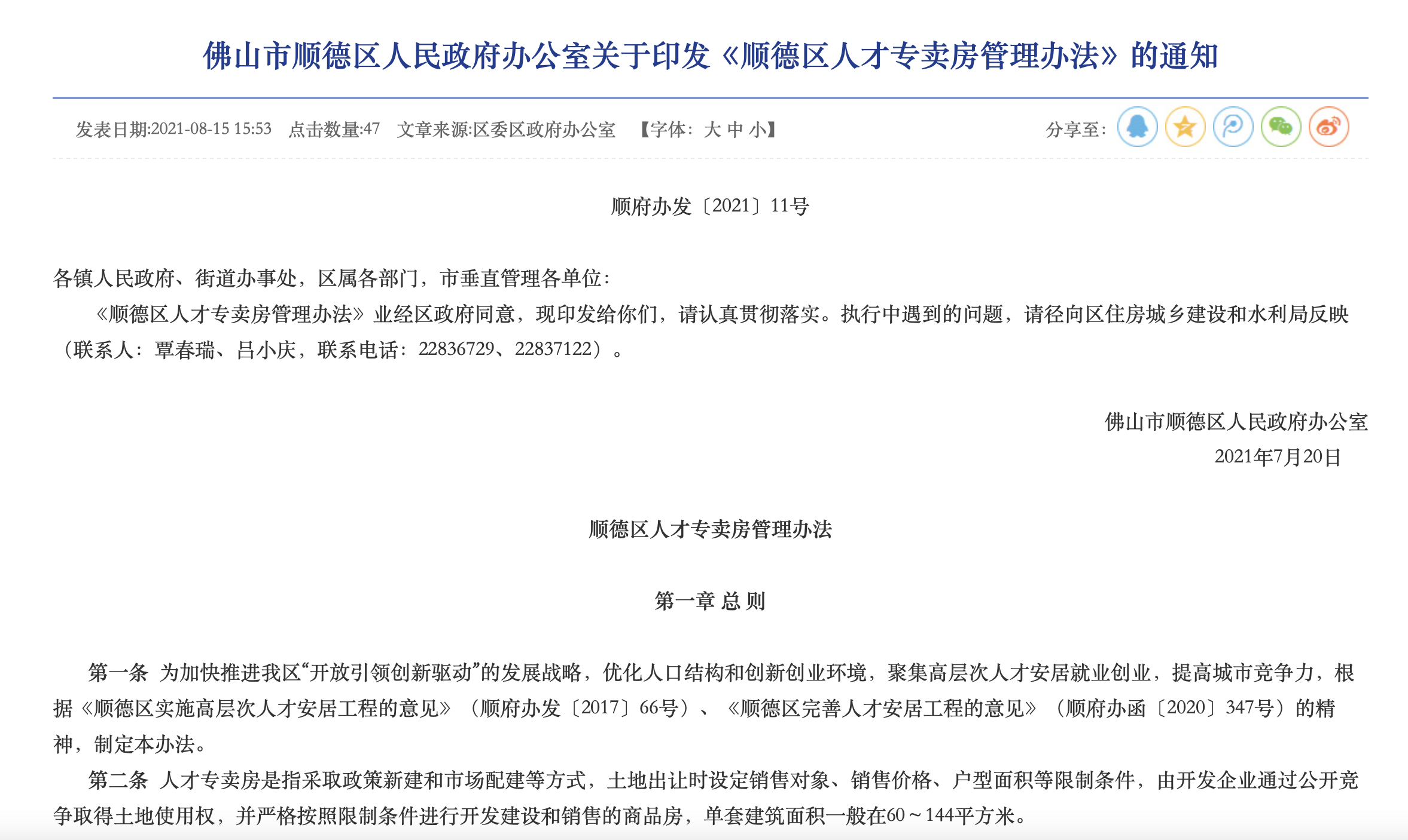 就《办法》进行解读时,顺德区住房城乡建设和水利局相关负责人表示根据《顺德区完善人才安居工程的意见》的文件精神,在《办法》第二十三条明确人才购房需累计在顺德工作满一定年限(5年)的要求,实现引才留才、服务顺德的真正目的。